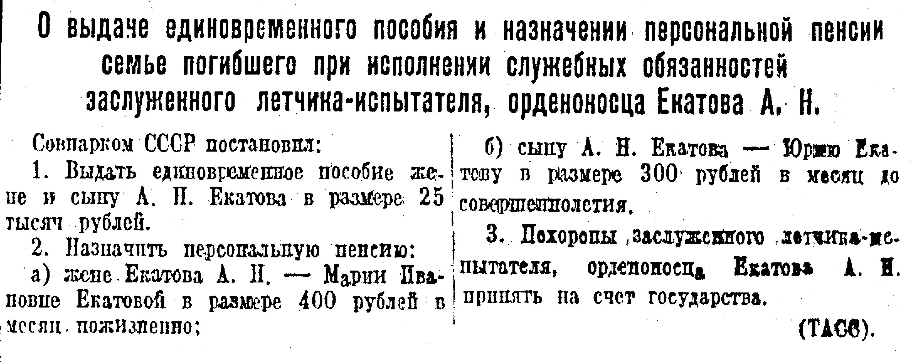 О выдаче единовременного пособия и назначении персональной пенсии семье погибшего при исполнении служебных обязанностей заслуженного летчика — испытателя, орденоносца Екатова А. Н.