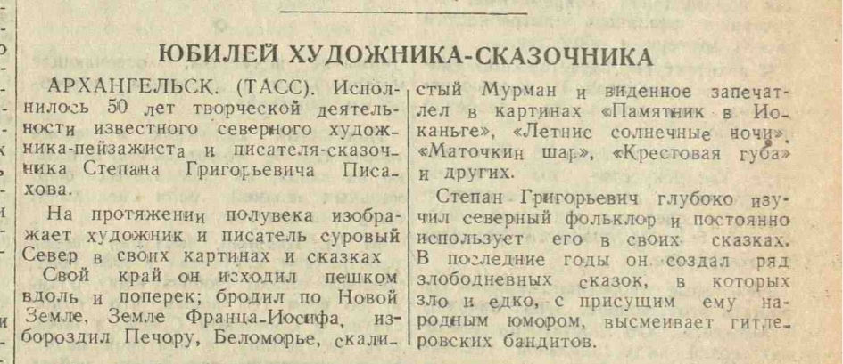 В члены союза писателей принят талантливый сказочник из Архангельска С. Писахов. Его сказки полны народного юмора, острой сатиры, неисчерпаемой ‘фантазии и написаны исключительно богатым образным языком.