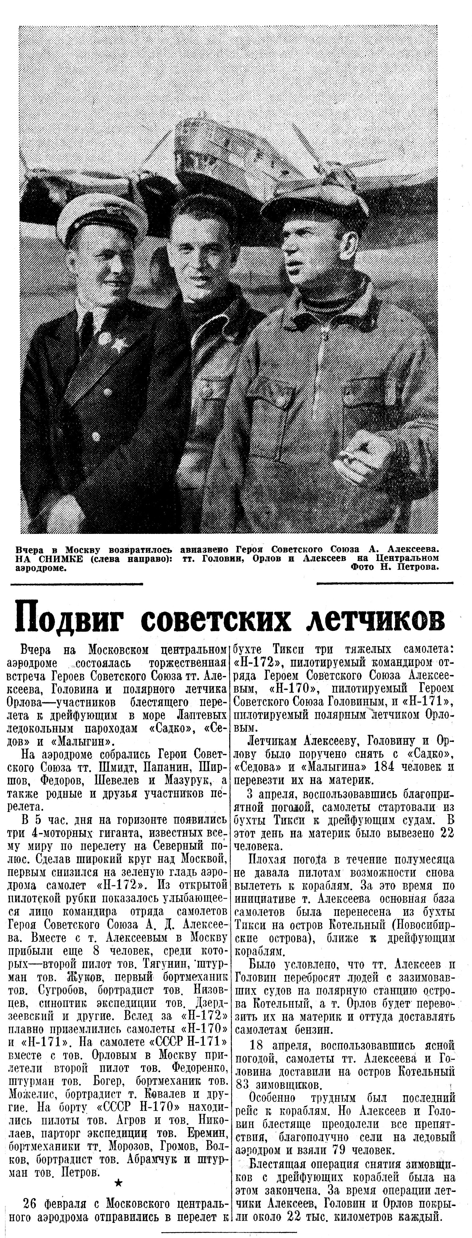 Вчера на Московском центральном аэродроме состоялась торжественная встреча Героев Советского Союза тт. Алексеева, Головина и полярного летчика Орлова—участников блестящего перелета к дрейфующим в море Лаптевых ледокольным пароходам «Садко», «Седов» и «Малыгин».