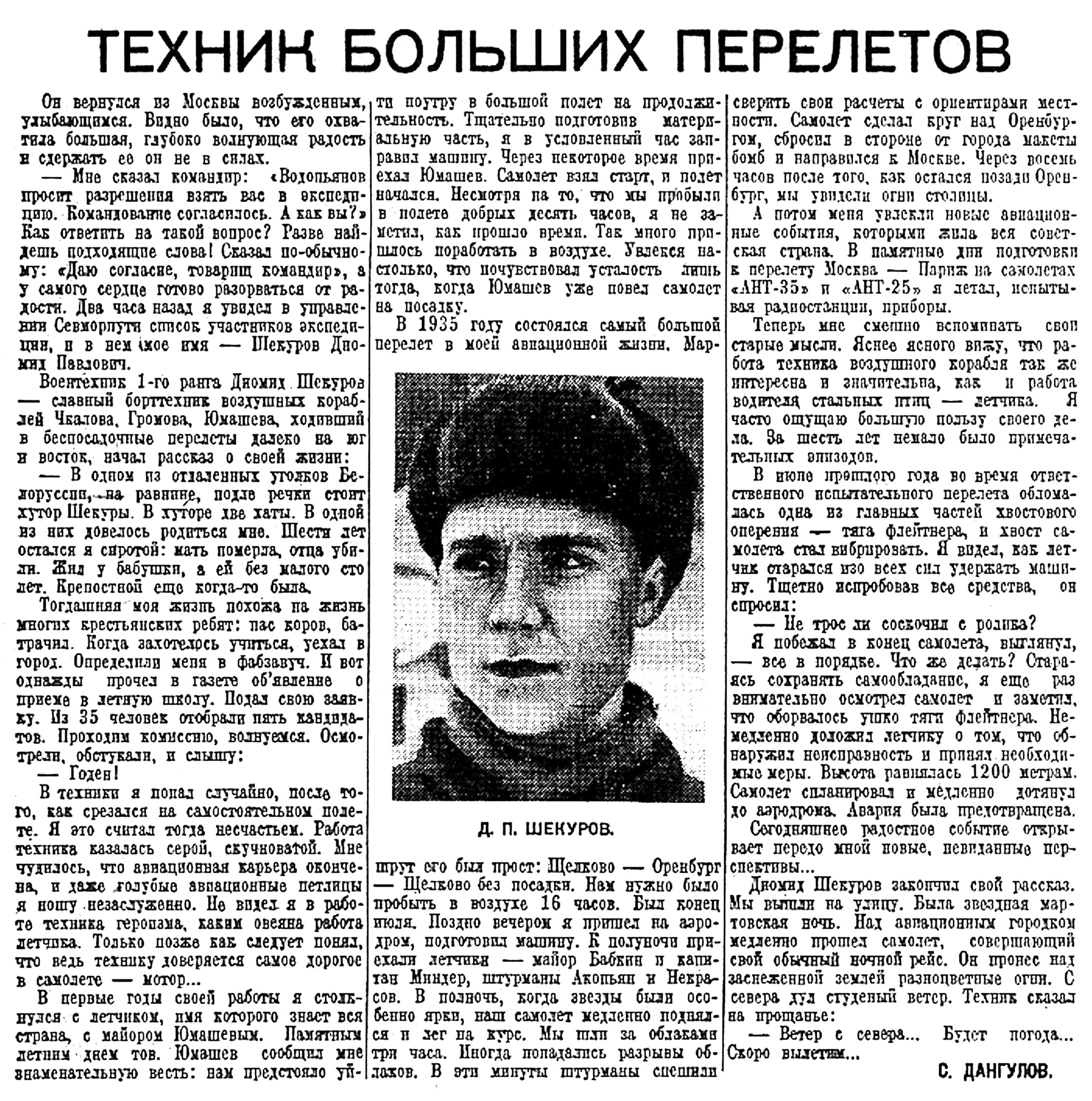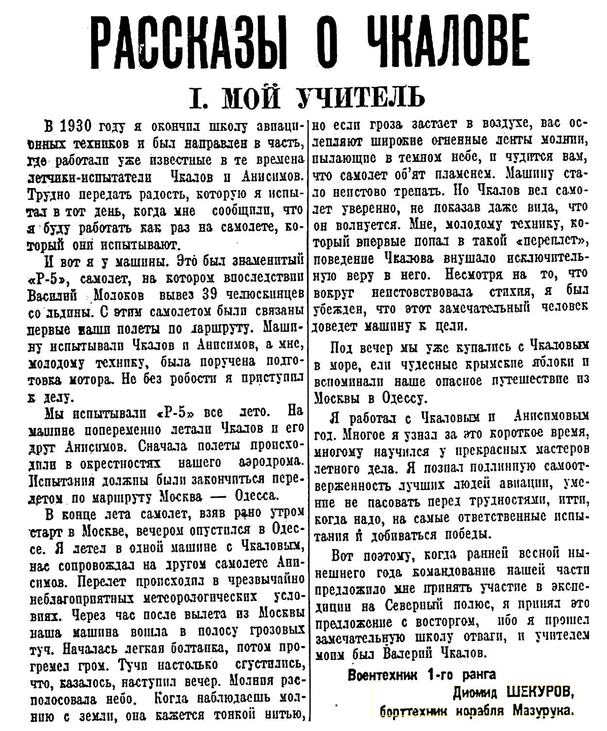 Воентехник 1-го ранга Диомид Шекуров — славный борттехник воздушных кораблей Чкалова. Громова, Юмашева, ходивший в беспосадочные перелеты далеко на юг и восток, начал рассказ о своей жизни: