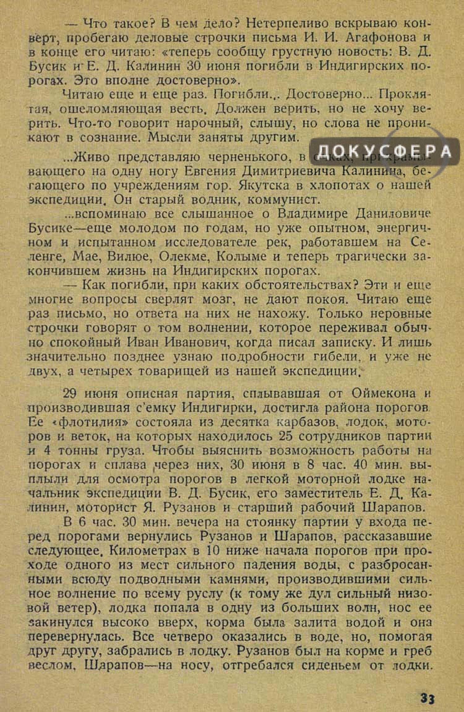 «29 июня описная партия, сплавлявшаяся от Оймякона и производившая съемку Индигирки, достигла районов порогов. Ее флотилия состояла из десятка карбазов, моторных лодок и веток /одноместная як. лодка/, на которых находилось 25 сотрудников партии и 4 тонны груза. Чтобы выяснить возможность работы на порогах и сплава через них, 30 июня в 8 час. 40 мин, выплыли для осмотра порогов в легкой моторной лодке начальник экспедиции В.Д. Бусик, его заместитель Е.Д. Калинин, моторист Я. Рузанов и старший рабочий Шарапов.