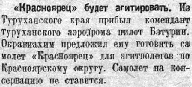 «Красноярец» будет агитировать. Из Туруханского края прибыл комендант Туруханского аэродрома пилот Батурин. Окравиахим предложил ему готовить самолет «Красноярец» для агитполетов по Красноярскому округу. Самолет на консервацию не ставится.