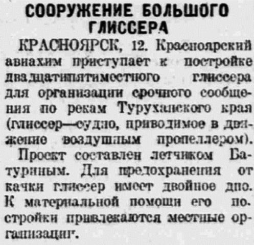 КРАСНОЯРСК, 12. Красноярский авиахим приступает к постройке двадцатипятиместного глиссера для организации срочного сообщения по рекам Туруханского края (глиссер — судно, приводимое в движение воздушным пропеллером).