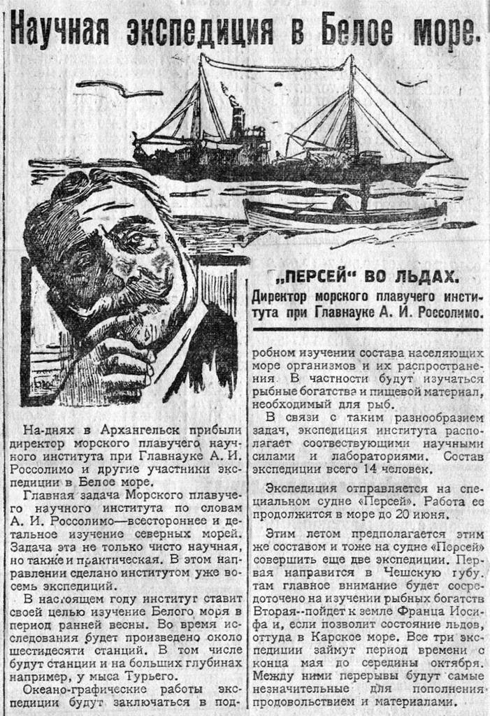 На-днях в Архангельск прибыли директор морского плавучего научного института при Главнауке А. И. Россолимо и другие участники экспедиции в Белое море.