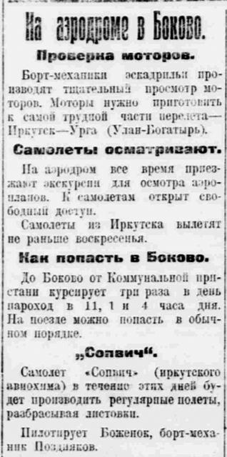 5 июля 1925 года на аэродроме в Боково приземлился самолет юнкерс-13 "Промбанк", купленный в Германии на средства, собранные в Иркутской губернии. В середине июля пилот Боженок с бортмехаником Поздняковым выполнили на "Промбанке" над городом показательные платные полеты с пассажирами.