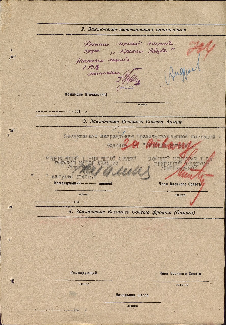 В Красной армии с июля 1941 года. Ранее награжден: орденом Красной Звезды, медалью «За отвагу», «За боевые заслуги», «За выслугу лет в К. А. », «За оборону Ленинграда», «За оборону Сталинграда», «За оборону Москвы», «За оборону Кавказа».