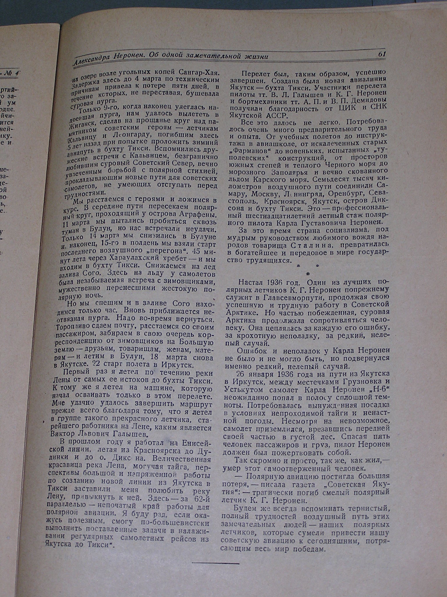 — Полярную авиацию постигла большая потеря, — писала газета „Советская Якутия": — трагически погиб смелый полярный летчик К. Г. Неронен.