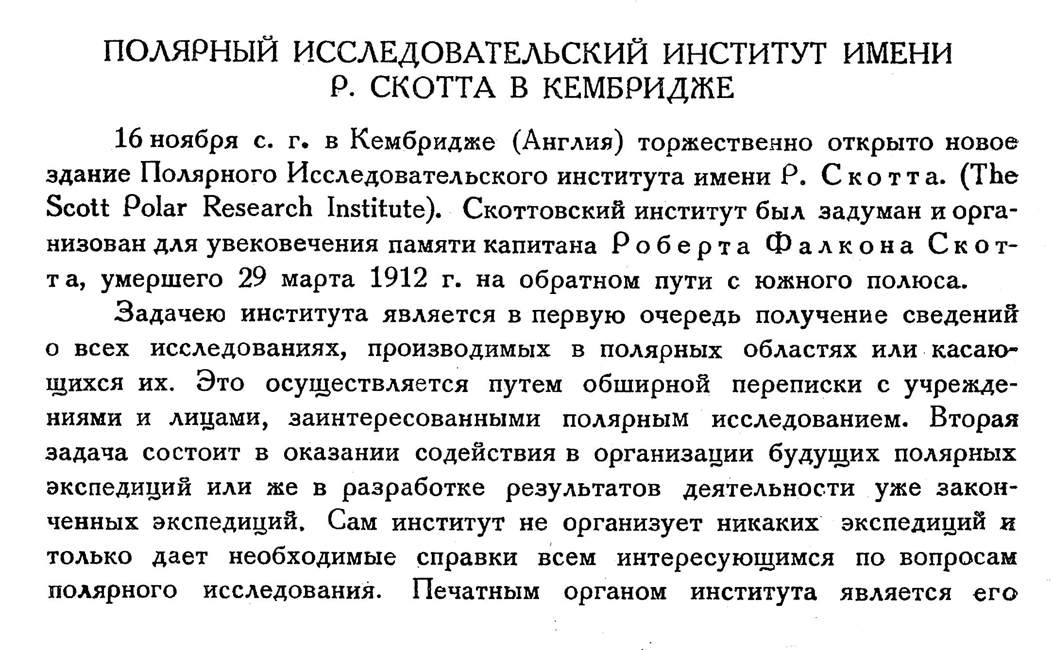 16 ноября с. г. в Кембридже (Англия) торжественно открыто новое здание Полярного Исследовательского института имени Р. Скотта. (The Scott Рolar Research Institute). Скоттовский институт был задуман и организован для увековечения памяти капитана Роберта Фалкона Скотта, умершего 29 марта 1912 г. на обратном пути с южного полюса.