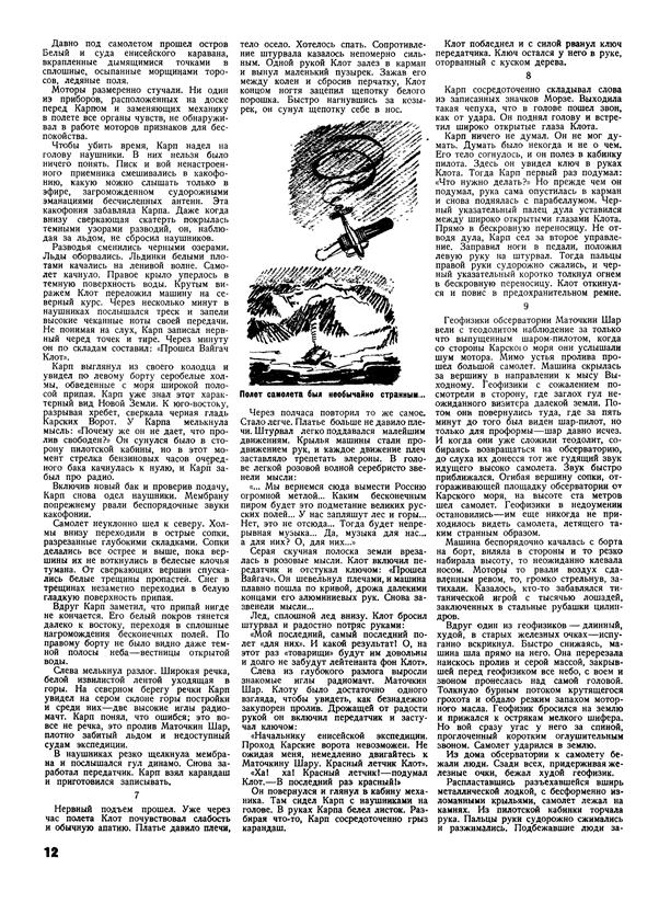 Геофизики обсерватории Маточкин Шар вели с теодолитом наблюдение за только что выпущенным шаром-пилотом, когда со стороны Карскою моря они услышали шум мотора. Мимо устья пролива прошел большой самолет. Машина скрылась за вершину в направлении к мысу Выходному. Геофизики с сожалением посмотрели в сторону, где заглох гул неожиданного визитера далекой земли. Потом они повернулись туда, где за пять минут до того был виден шар-пилот, но только для проформы — шар давно исчез. И когда они уже сложили теодолит, собираясь возвращаться на обсерваторию, до слуха их донесся тот же гудящий звук идущего высоко самолета. Звук быстро приближался. Огибая вершину сопки, отгораживающей площадку обсерватории от Карского моря, на высоте ста метров шел самолет. Геофизики в недоумении остановились — им еще никогда не приходилось видеть самолета, летящего таким странным образом.