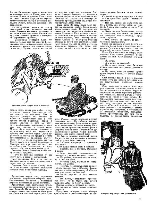 тора. Машина взвыла моторами и резко повернула вверх. Из кабинки высунулись всполошенные физиономии механика и навигатора. Но через минуту Клот снова нашел нужное ему колено реки и уверенно пошел вниз. Загромыхало дуралюминиевое днище. Лодка вспенила темную воду мирно спящей реки.