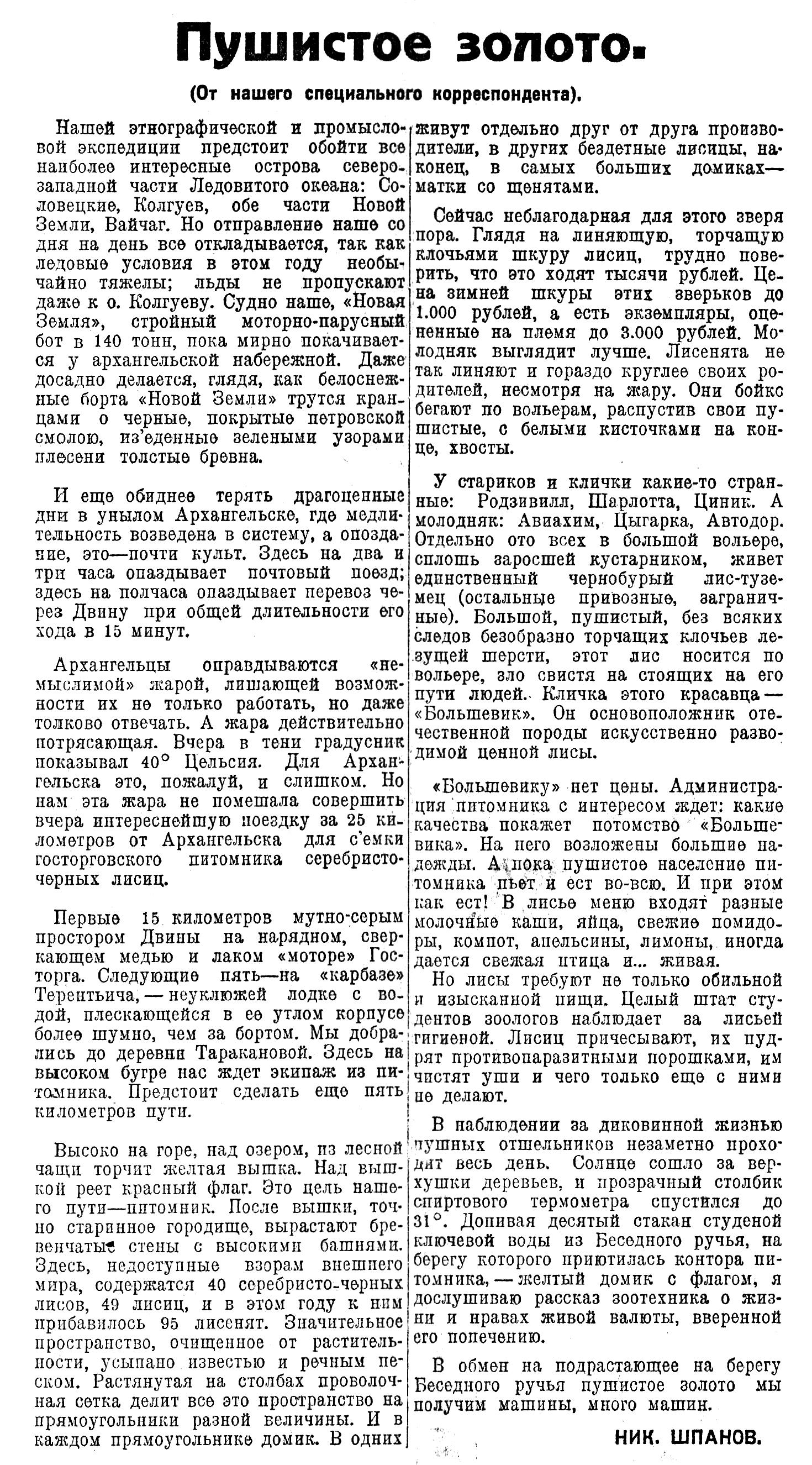 Архангельцы оправдываются «немыслимой» жарой, лишающей возможности их не только работать, но даже толково отвечать. А жара действительно потрясающая. Вчера в тени градусник показывал 40° Цельсия. Для Архангельска это, пожалуй, и слишком. Но нам эта жара не помешала совершить вчера интереснейшую поездку за 25 километров от Архангельска для съемки госторговского питомника серебристо-черных лисиц.