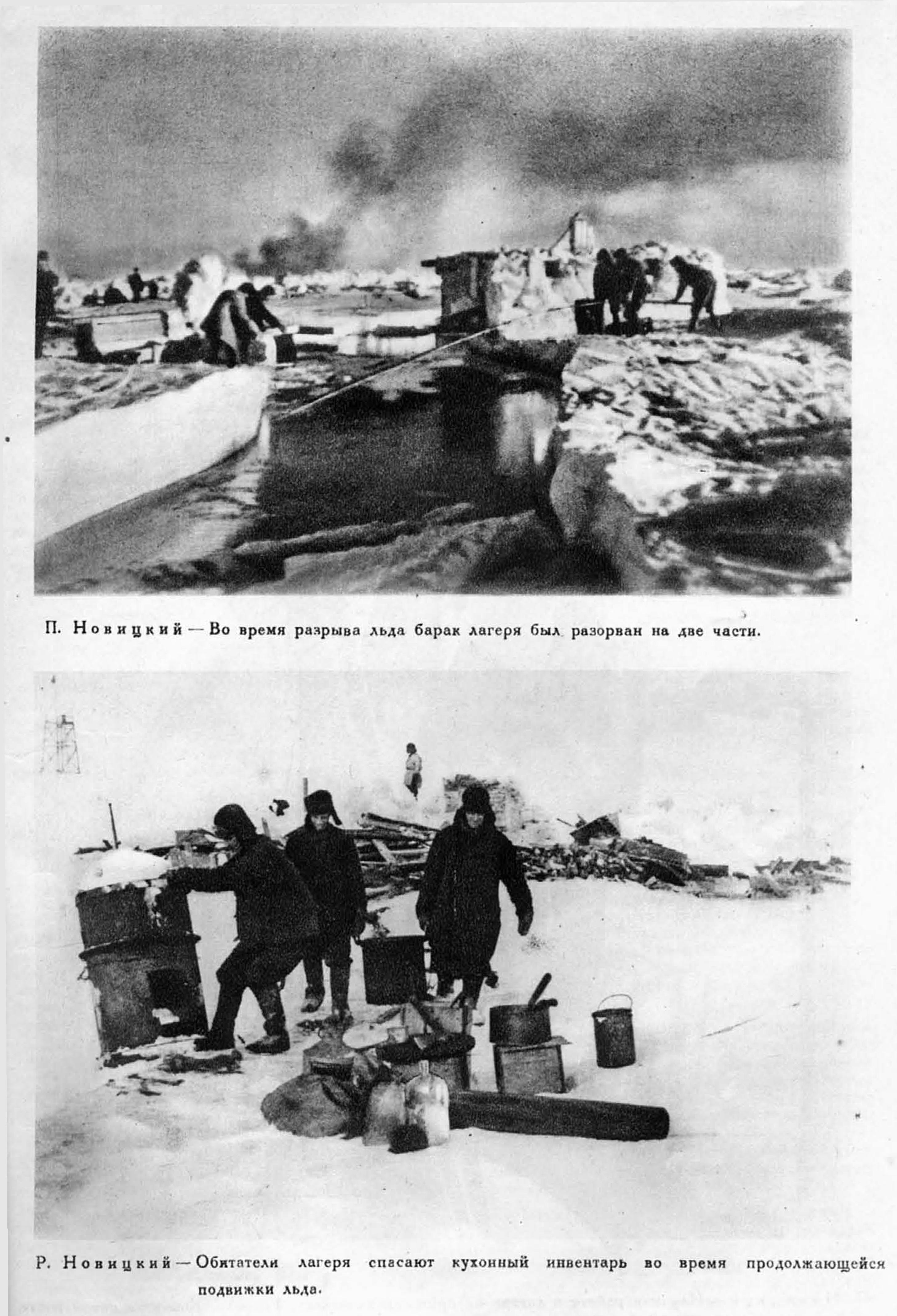 Моменты движения судна, жизнь и быт лагеря Шмидта на дрейфующем льду, вывозка людей самолетами, сжатие ледяными полями, тяжелый труд по оборудованию аэродромов, по выколке всплывших из-под льда, где погиб «Челюскин», бревен и досок — все это отражено на кадрах П. К. Новицкого. Ценность, значение этих кадров для истории советского освоения Севера грандиозны.