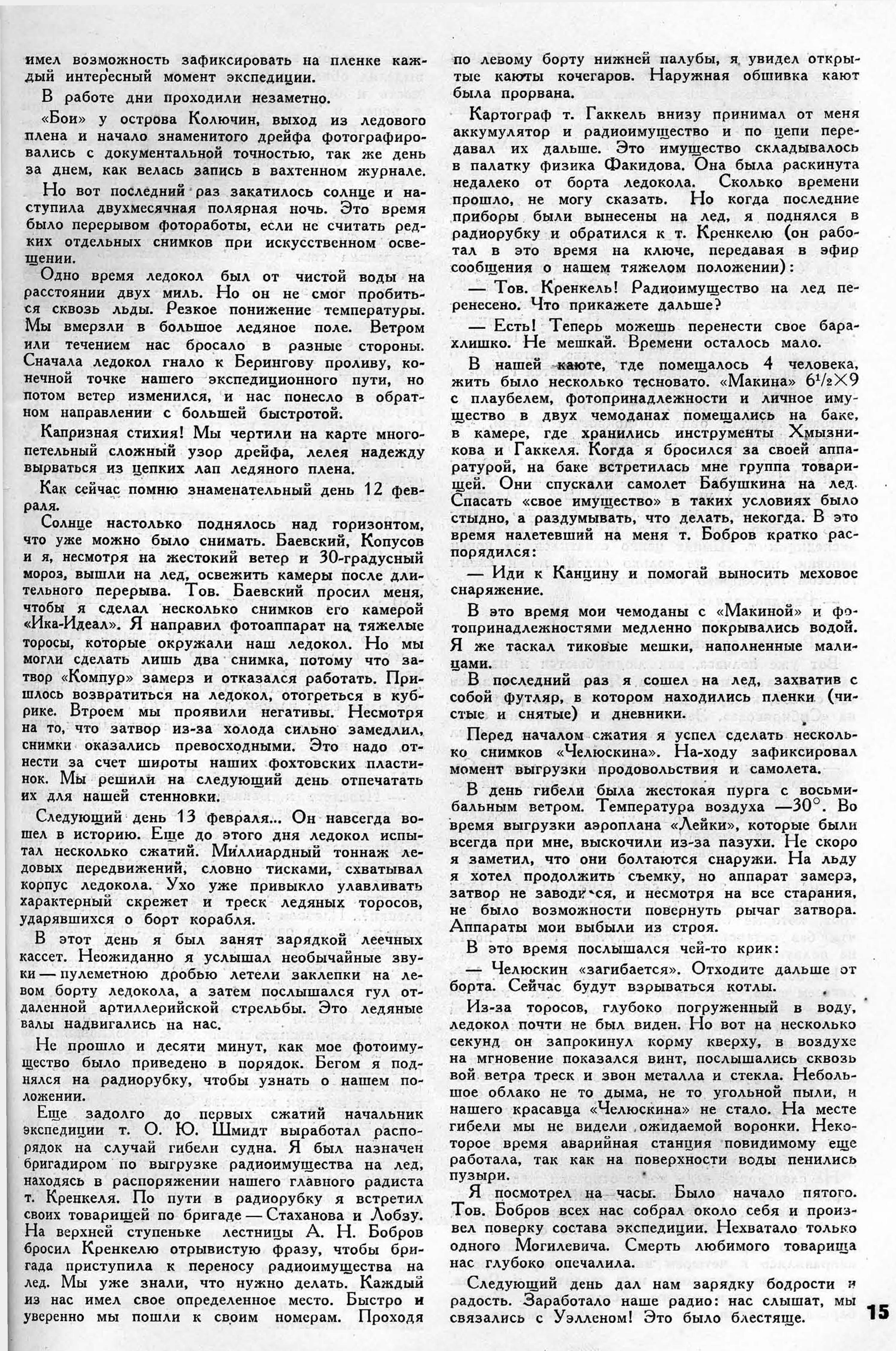 С момента выхода «Челюскина» из Ленинграда и до триумфального вступления полярников в Москву мною, снято 500 м негативной пленки, около 15 000 снимков. В числе других у меня была не совсем свежая пленка Геверт. Эта пленка дала наибольший брак. Все снятое на ней после проявления было потеряно (пятая часть всех снимков). Пленка настолько разложилась, что изображение почти исчезло.