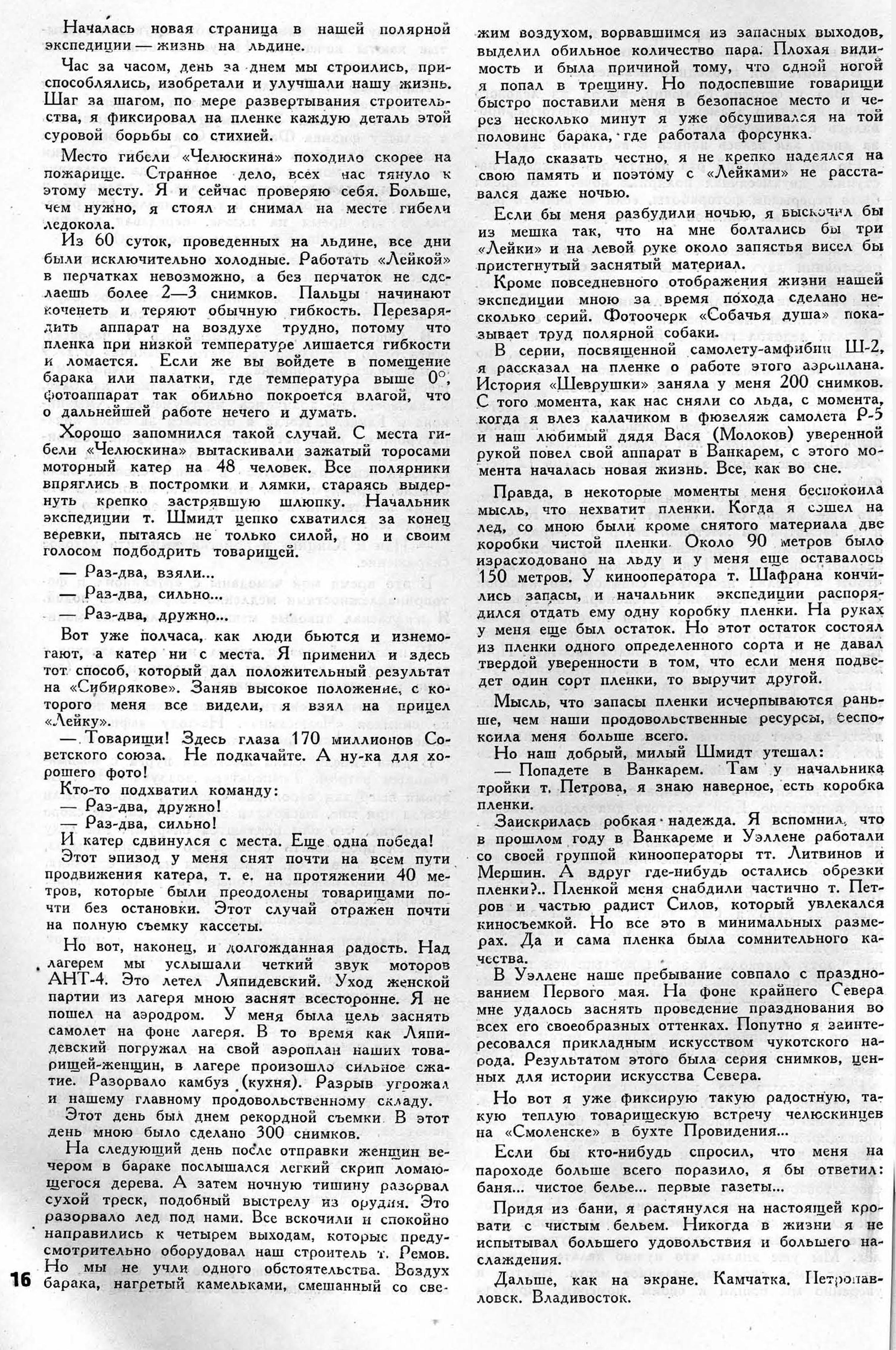 В серии, посвященной самолету-амфибии Ш-2, я рассказал на пленке о работе этого аэроплана. История «Шеврушки» заняла у меня 200 снимков. С того момента, как нас сняли со льда, с момента, когда я влез калачиком в фюзеляж самолета Р-5 и наш любимый дядя Вася (Молоков) уверенной рукой повел свой аппарат в Ванкарем, с этого момента началась новая жизнь. Все, как во сне.