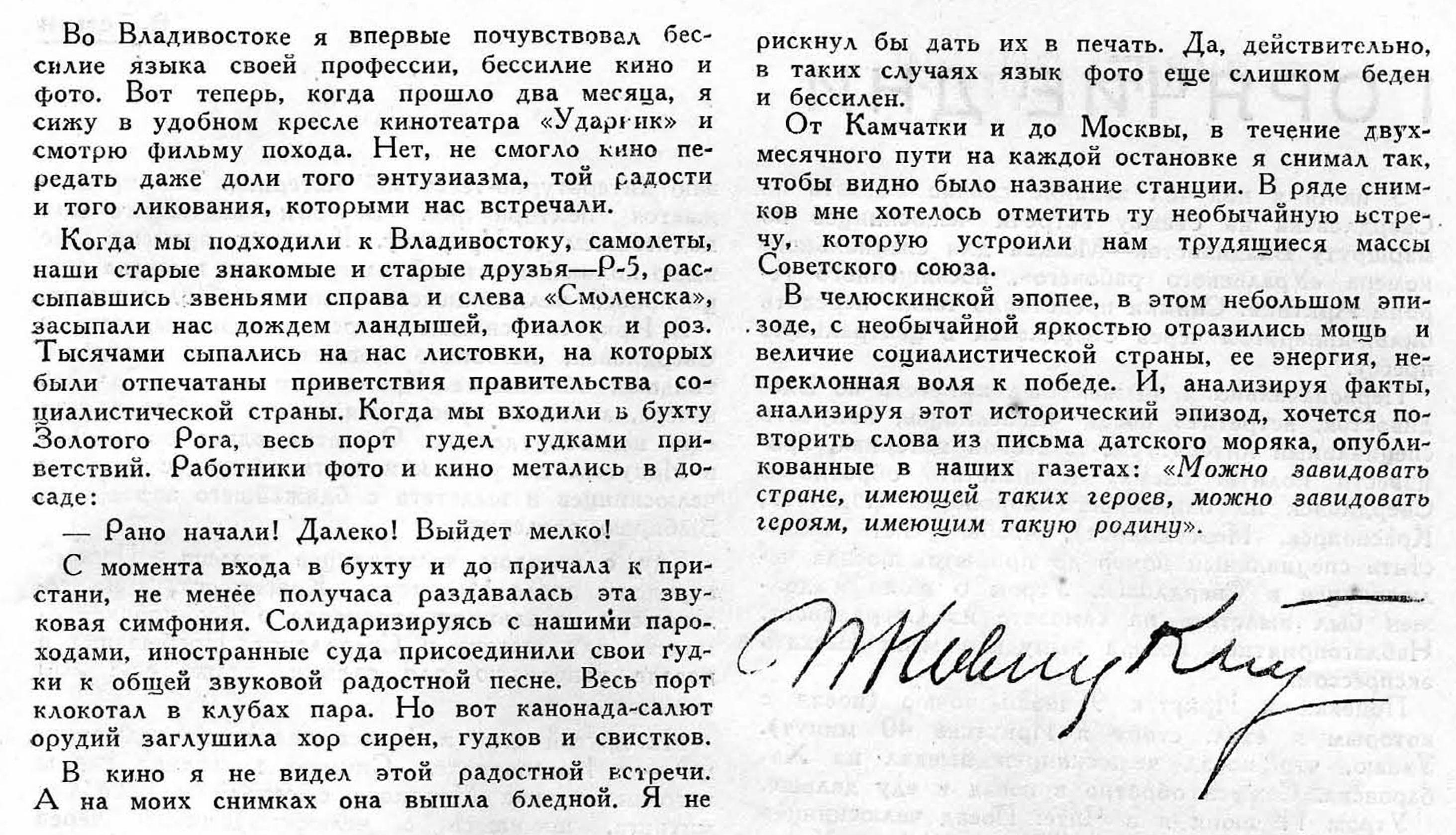 В числе первых фоторепортеров, прилетевших на встречу челюскинцев, был фотоработник хабаровской газеты т. Кулыгин. Он добрался даже до Ванкарема. Он убедил меня отдать ему катушку с ценными снимками. Тов. Кулыгин обещал быстро их проявить, отпечатать и немедленно возвратить. Но увы, с тех пор я его не видел больше и не получил от него снимков. Как жаль, что некоторые работники печати так легкомысленно относятся к историческим документам, которые, конечно, надо сберегать со всею тщательностью.