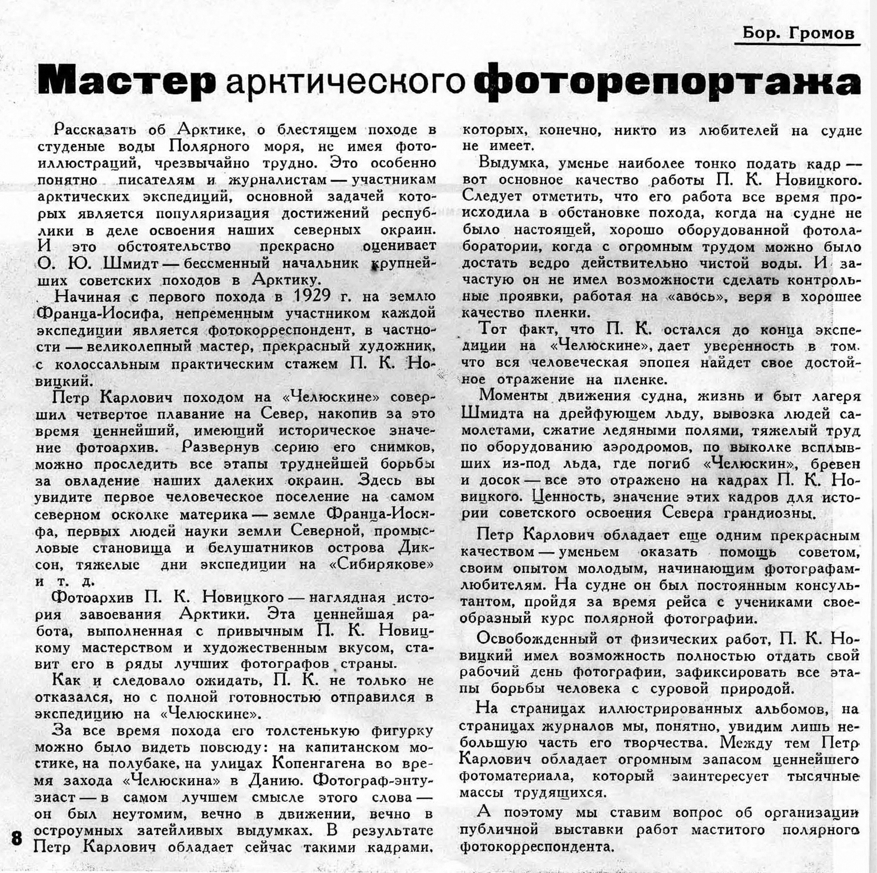 Начиная с первого похода в 1929 г. на землю Франца-Иосифа, непременным участником каждой экспедиции является фотокорреспондент, в частности — великолепный мастер, прекрасный художник, с колоссальным практическим стажем П. К. Новицкий.