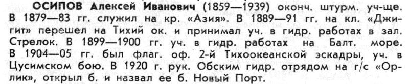 ОСИПОВ Алексей Иванович (1859—1939*) оконч. штурм. уч-ще. В 1879—83 гг. служил на кр. «Азия». В 1889—91 гг. на кл. «Джигит» перешел на Тихий ок. и принимал уч. в гидр, работах в зал. Стрелок. В 1899—1900 гг. уч. в гидр, работах на Балт. море. В 1904—05 гг. был флаг. оф. 2-й Тихоокеанской эскадры, уч. в Цусимском бою. В 1920 г. рук. Обским гидр. отрядом на г/с «Орлик», открыл б. и назвал ее б. Новый Порт.