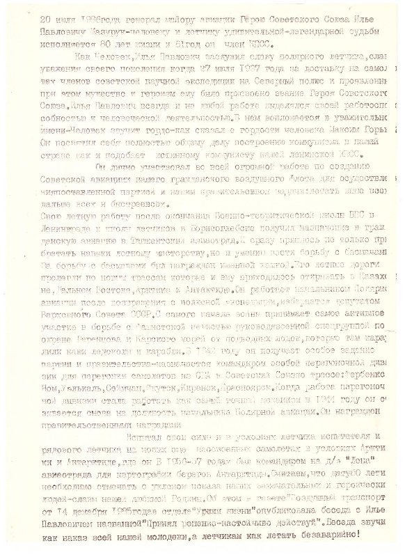 Текст поздравления Д.Ф.Островенко Ильи Павловича Мазурука с 80-летием. 1986 г. // Из фондов МАУК "Краеведческий музей городского округа Эгвекинот".