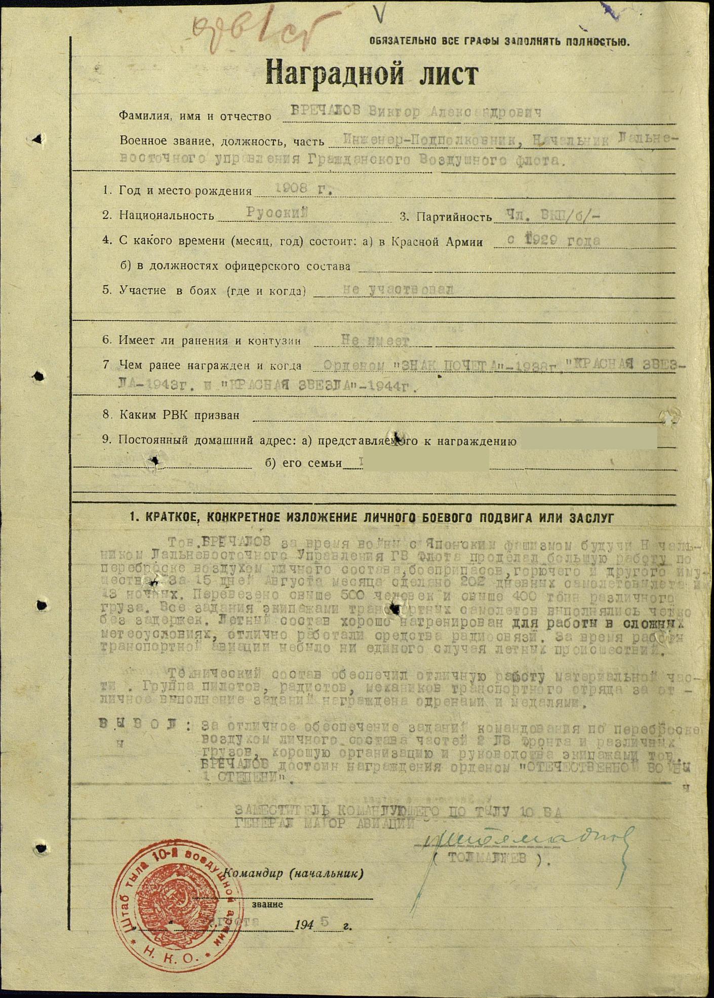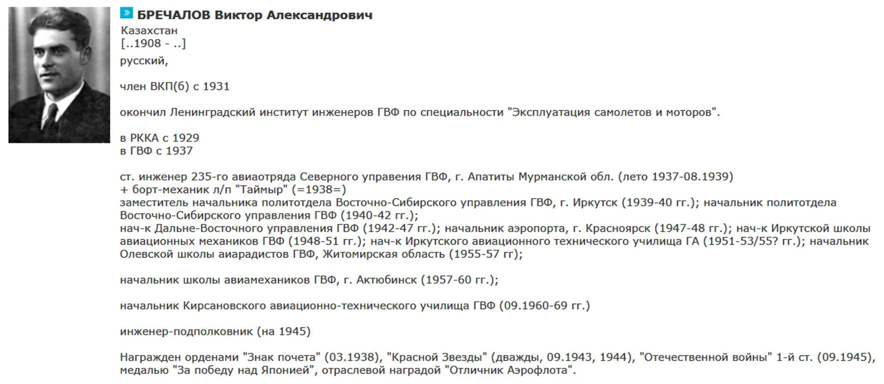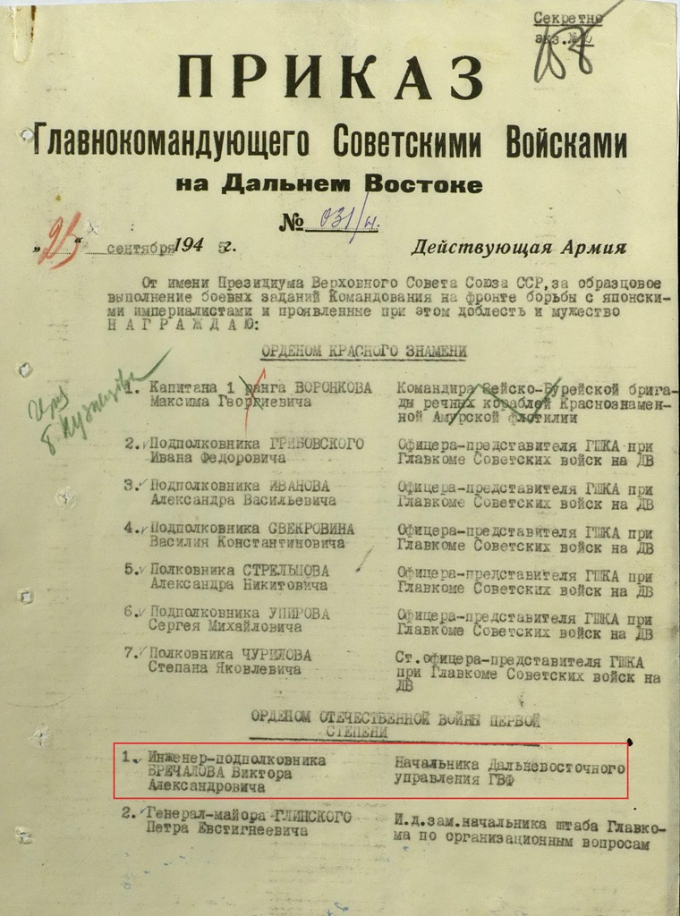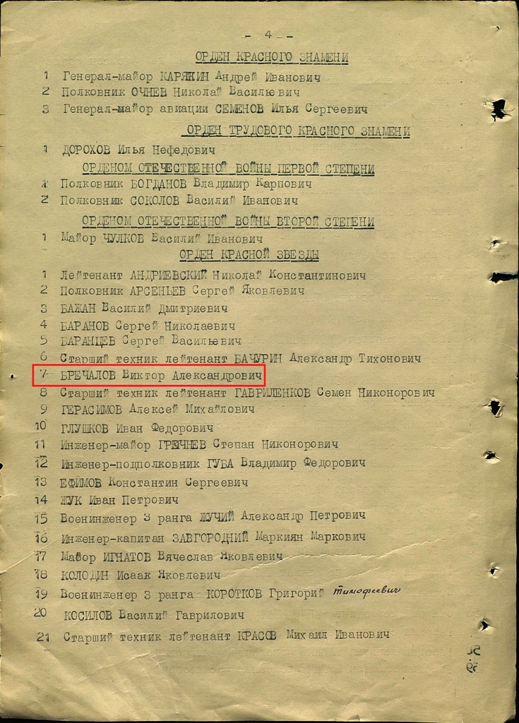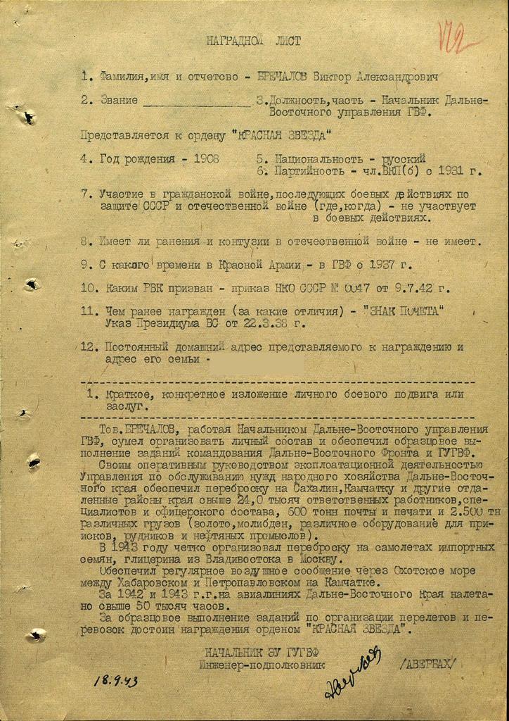 Тов. БРЕЧАЛОВ, работая Начальником Дальне-Восточного управления ГВФ, сумел организовать личный состав и обеспечил образцовое выполнение задании командования Дальне-Восточного Фронта и ГУГВФ.