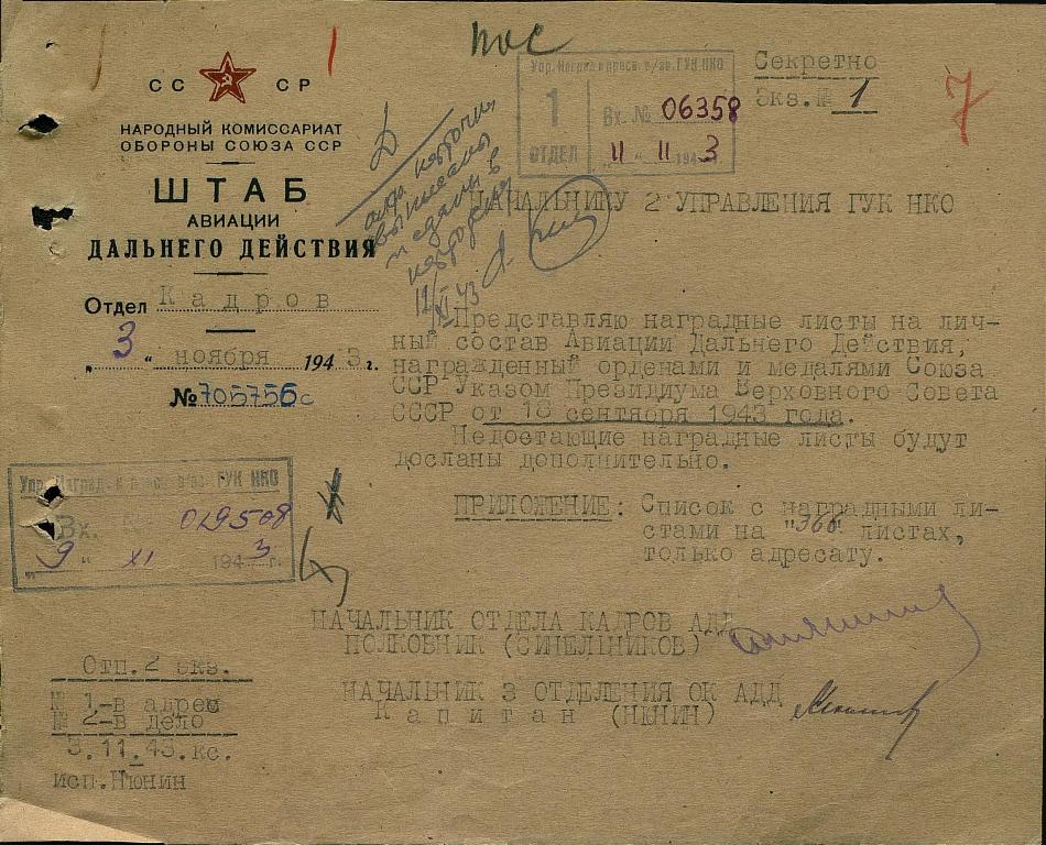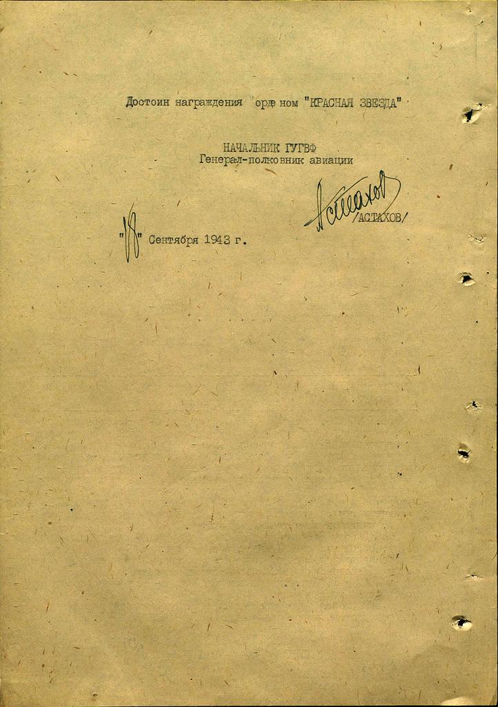 За образцовое выполнение заданий по организации перелетов и перевозок достоин награждения орденом "КРАСНАЯ ЗВЕЗДА".