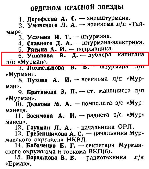 6. Ушакова В. Д. — дублера капитана л/п «Мурман».
