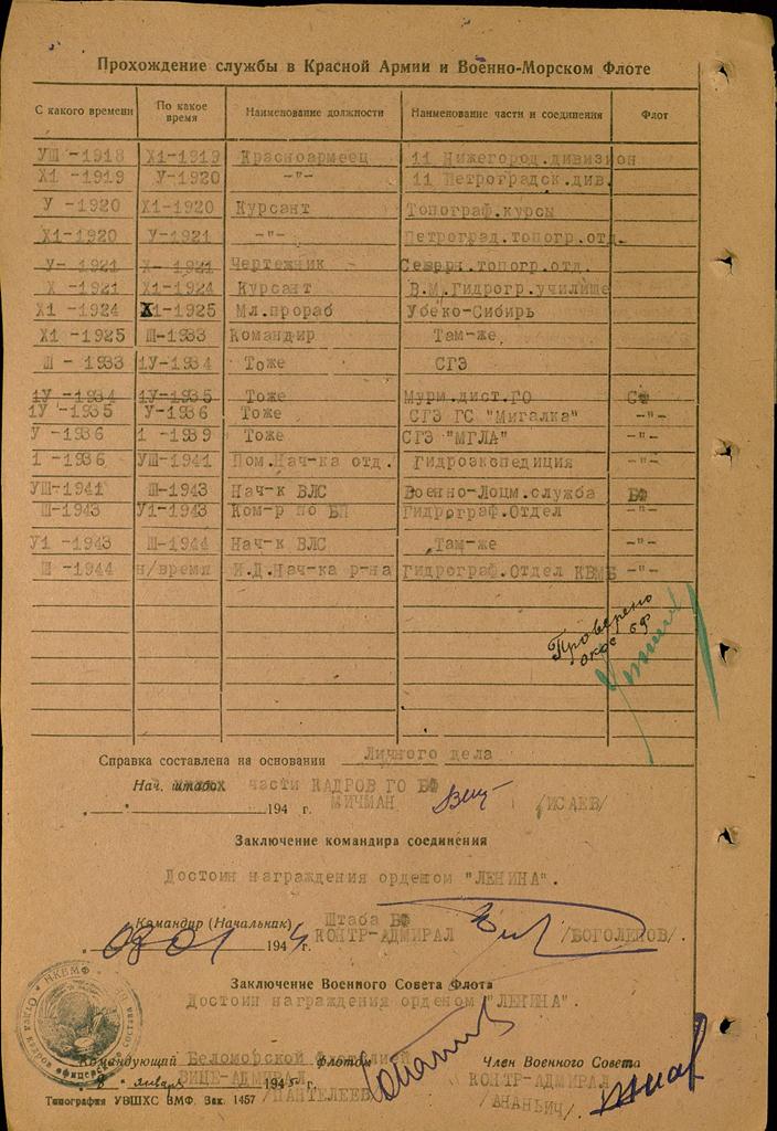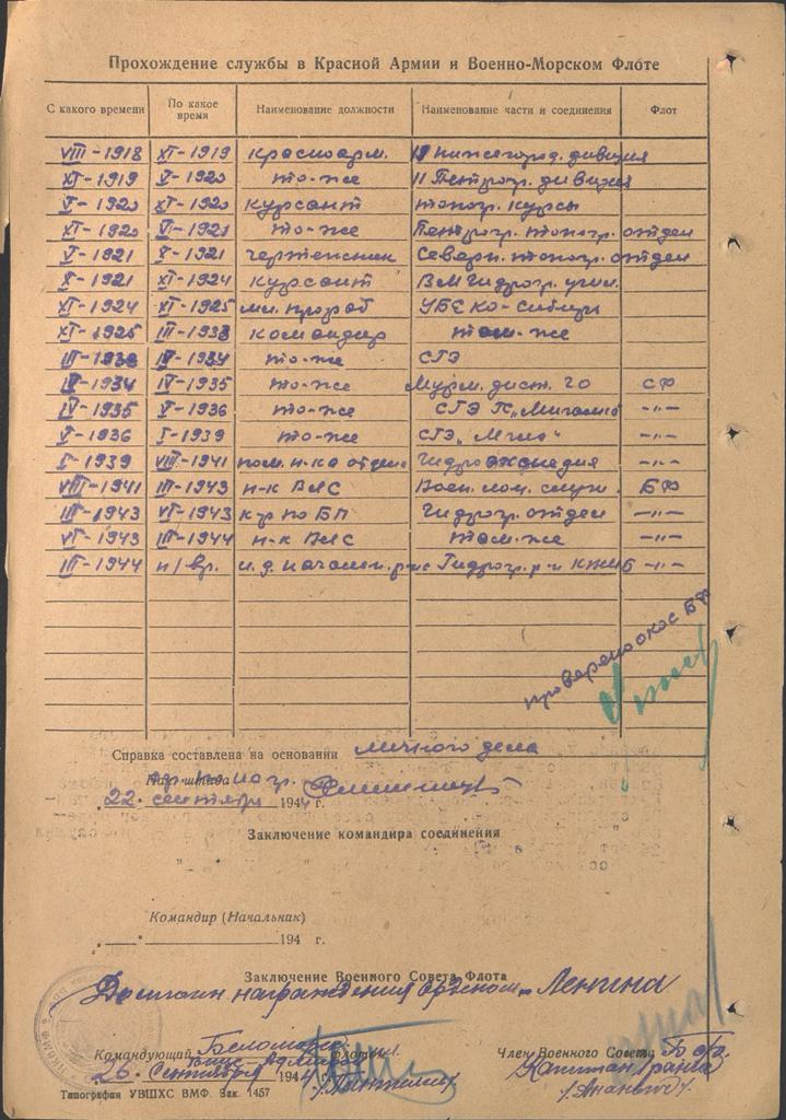 VIII-1941 III-1943 Нач-к ВЛС Воeнно-Лоцм. служба БФ