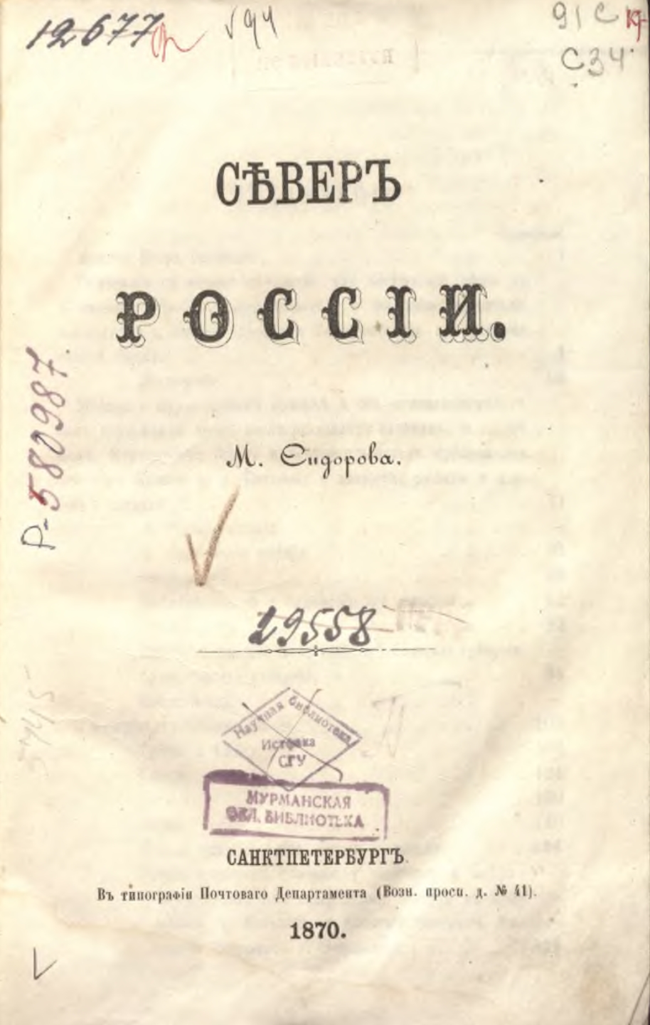 Сидоров М. К. Cевер России. - Санкт-Петербург : в типографии Почтового департамента, 1870. - [2], ХХIII, 556, [1] с. : табл.