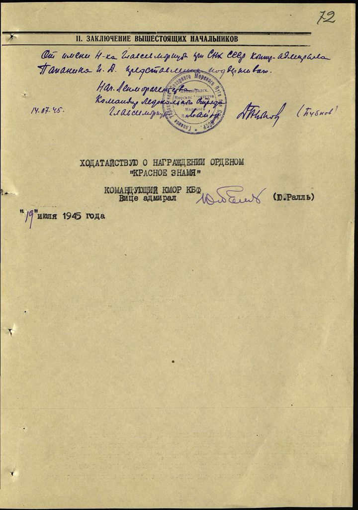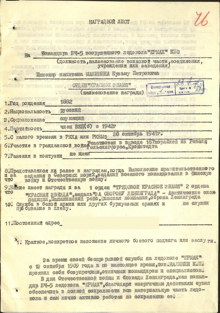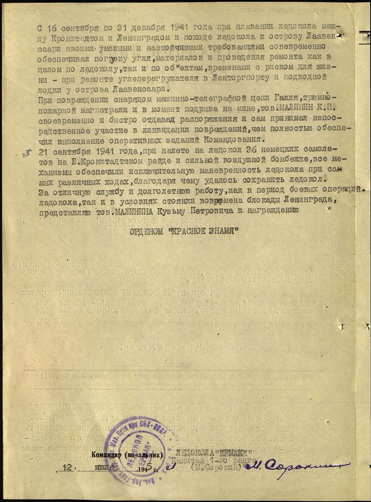 За отличную службу и долголетнюю работу, как в период боевых операций ледокола, так и в условиях стоянки во времена блокады Ленинграда, представляю тов. МАЛИНИНА Кузьму Петровича к награждению ОРДЕНОМ "КРАСНОЕ ЗНАМЯ"