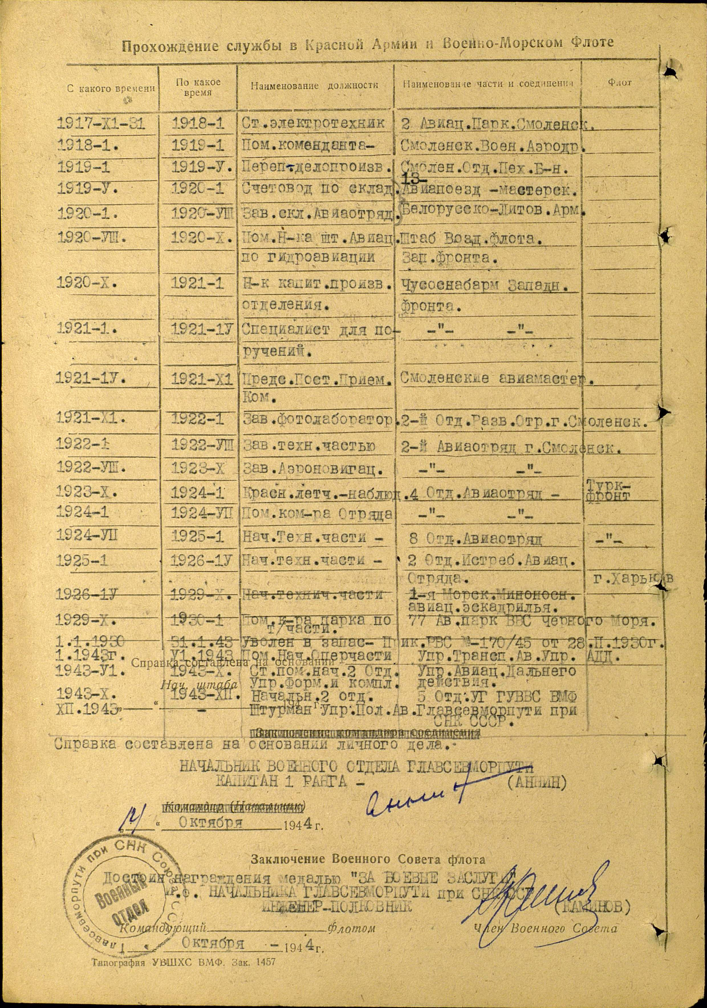 - с января 1918 года по январь 1919 года он помощник коменданта Смоленского военного аэродрома;