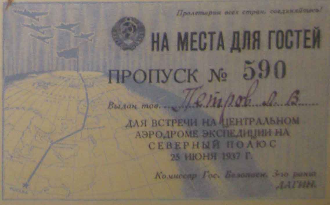 Пропуск Л.В. Петрова на Центральный аэродром для торжественной встречи экспедиции СП-1 и встречи на вокзале экипажа М.М. Громова
