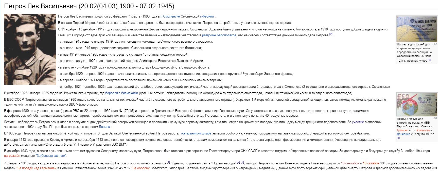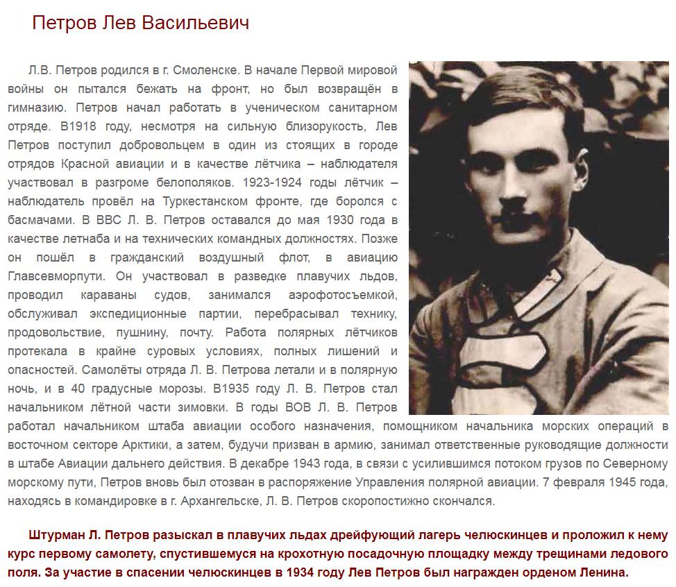 Петров Лев Васильевич (1898-1945). Родился в г. Смоленск. В начале Первой мировой войны пытался бежать на фронт, но был возвращён в гимназию. В 1918 г., несмотря на близорукость, поступил добровольцем в один из стоящих в городе отрядов Красной авиации и в качестве летчика-наблюдателя участвовал в разгроме белополяков. В 1923-1924 гг. боролся с басмачами на Туркестанском фронте. В ВВС оставался до мая 1930 г. затем перешёл в авиацию Главсевморпути. Участвовал в разведке плавучих льдов, проводил караваны судов, занимался аэрофотосъёмкой, обслуживал экспедиционные партии. В 1934 г. в составе экипажа АНТ-4 А. В. Ляпидевского первым обнаружил дрейфующий лагерь челюскинцев, за что награждён орденом Ленина. В 1935 г. стал начальником лётной части зимовки.