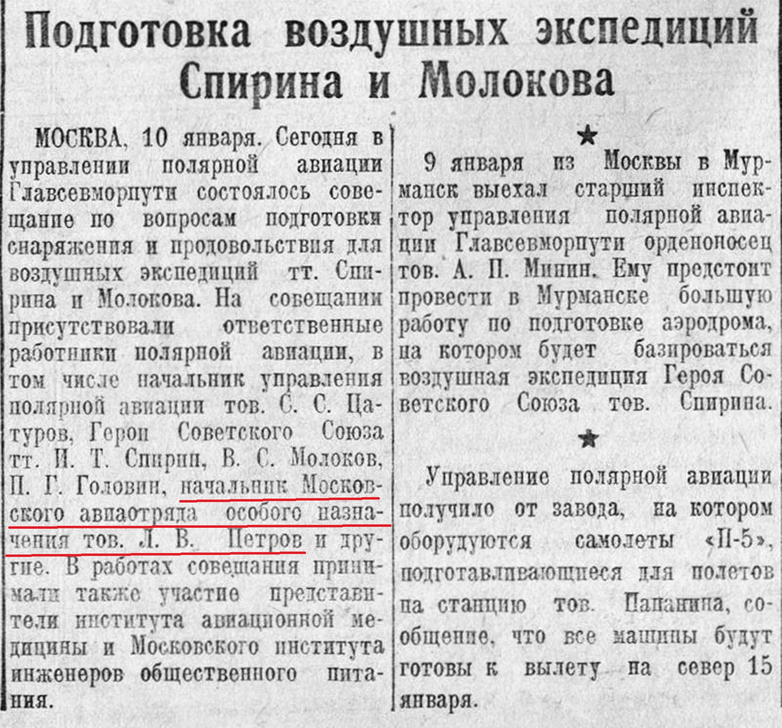 "Теперь, к сожалению, никого из участников той славной экспедиции не осталось в живых. Но их имена должны остаться в истории освоения Арктики. И, восполняя этот существенный пробел в прекрасной книге С. В. Обручева, я отдаю дань глубокого уважения командиру самолета, штурману Петрову Льву Васильевичу, первому пилоту Страубе Георгию Александровичу, второму пилоту и механику Косухину Виталию Владимировичу, бортмеханику Борису Крутскому.