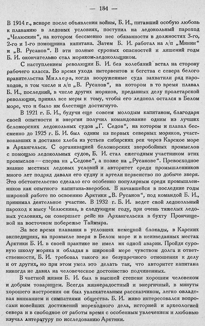 В 1921 г. Б. И., будучи еще совсем молодым капитаном, благодаря своей опытности и энергии получил командование одним из лучших беломорских ледокольных судов „Г. Седов", на котором и плавал бессменно до 1925 г. Б. И. был одним из первых северных моряков, участвовавших в доставке хлеба из устьев сибирских рек через Карское море в Архангельск. С организацией беломорских зверобойных промыслов с помощью ледокольных судов, Б. И. стал ежегодным участником этих промыслов — сперва на „Седове", а позже на „Русанове". Превосходное знание местных ледовых условий и авторитет среди промышленников много лет подряд давали его судну и артели первенство по добыче зверя. Это обстоятельство сделало его особенно популярным среди промышленников как опытного капитана-зверобоя. В начавшейся в последние годы широкой работе по освоению Арктики „В. Русанов", под командой Б. И., принимал деятельное участие. В 1932 г. Б. И. ведет свой ледокольный пароход к мысу Челюскина, в следующем году, при очень тяжелых ледовых условиях, он совершает рейс из Архангельска в бухту Прончищевой на восточном побережье Таймыра.