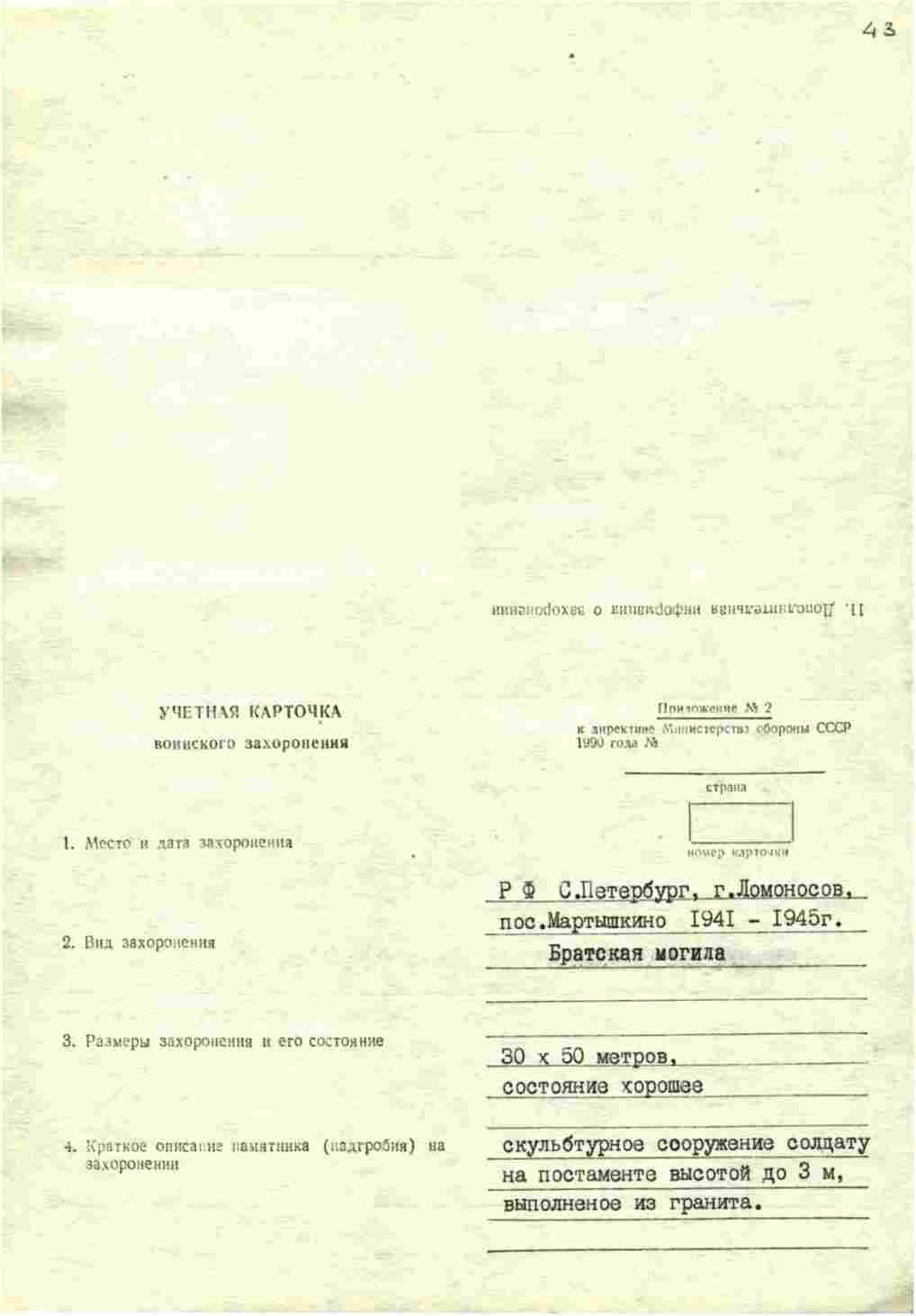 Место захоронения г. Ломоносов, п. Мартышкино, 1200 м восточнее ж/д платформы Мартышкино, с северной стороны ш. Ломоносов - Петродворец, воинское кладбище