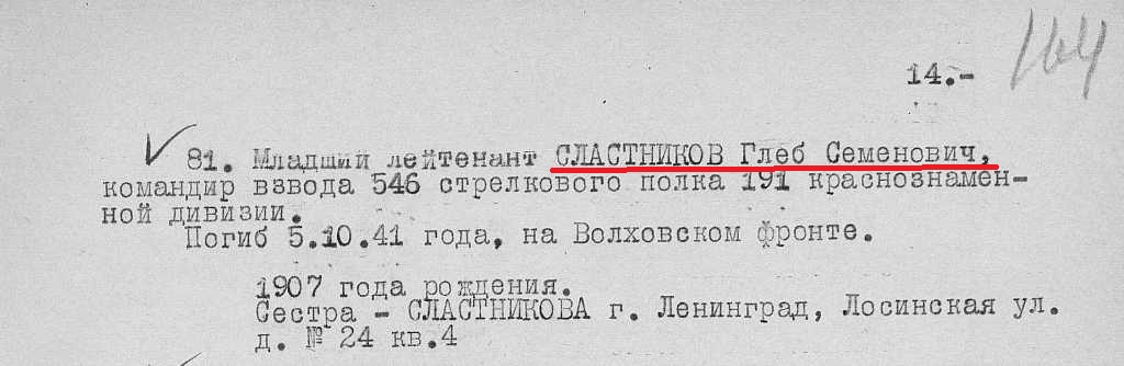 Младший лейтенант Г. С. Сластников был убит 3 октября 1941 г. у дер. Левдузи и похоронен на воинском кладбище г. Ораниенбаума.