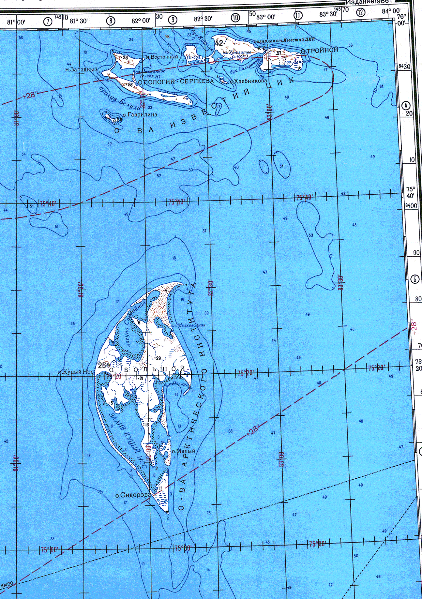 Глубины измѣрялись лотомъ Томсона и Клаузена черезъ каждые 1/4—1/2 часа и нанесены на карту, какъ по астрономическимъ наблюденіемъ, такъ и по пеленгамъ.