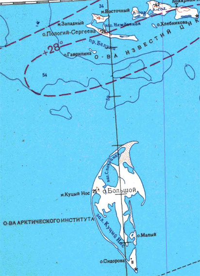 Планшетъ у острововъ Новосильцева на островѣ Вайгачъ основанъ на базисѣ, измѣренномъ стальною лентою, длиною 400 саженъ. Для оріентировки планшета по истинному мери-діану были сдѣланы засѣчки на два гурія работъ капитана Сергѣева. Направленіе базиса было опредѣлено береговымъ компасомъ и оказалось NО З9 1/4°. На всѣ эти работы потрачено 62,5 часа при 5,5 рабочихъ дняхъ, при чемъ опредѣлено точекъ по засѣчкамъ 27, дальномѣрно 170, поставлено знаковъ 11, береговой черты снято 14,77 верстъ и измѣрено 44 высоты.