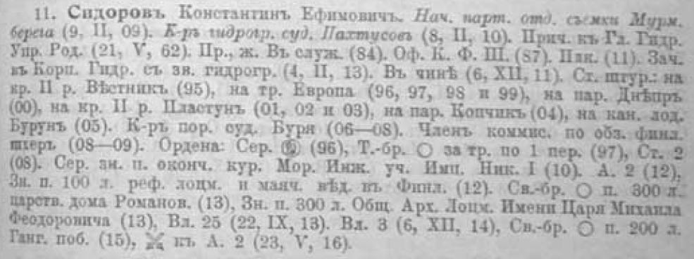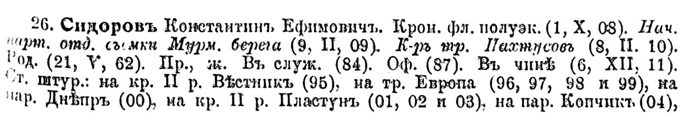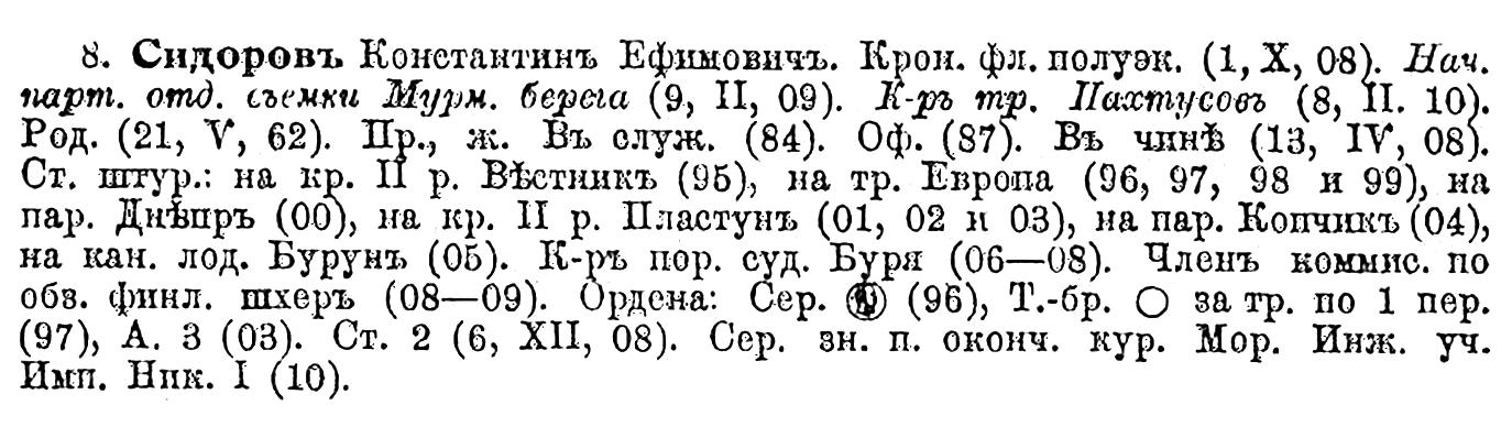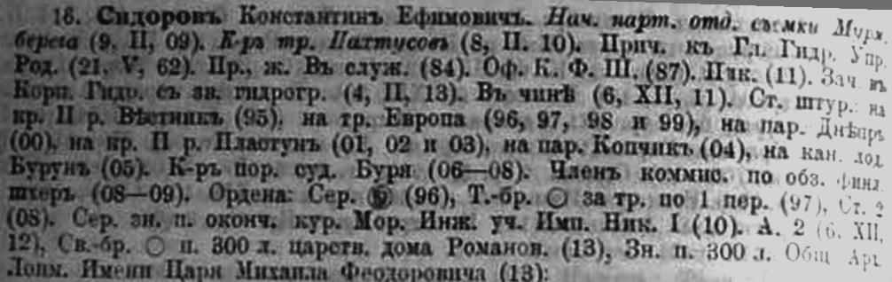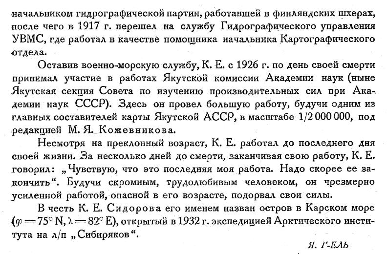 С 1910 по 1914 г. состоял начальником партии отдельной съемки Мурманского берега. В этот период времени, командуя гидрографическим судном „Пахтусов", К. Е. Сидоров плавал в Карском море. Здесь он явился пионером в деле постройки первых полярных гидрометеорологических радиостанций. По его указаниям построены первые русские полярные станции — Вайгач, Югорский Шар и Маре-Сале, открытые в 1914 г. (Я. Гаккель)