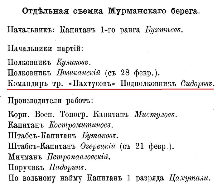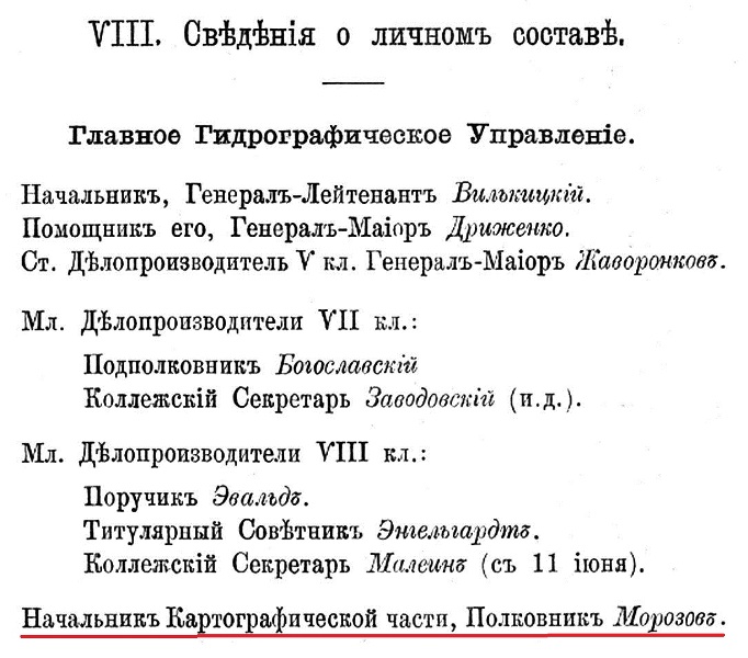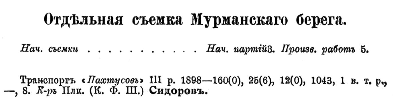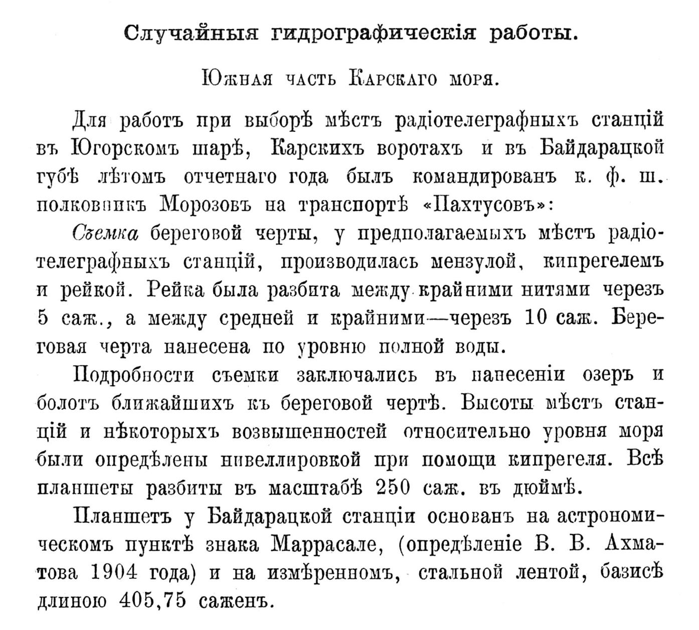 Для работъ при выборѣ мѣстъ радіотелеграфныхъ станцій въ Югорскомъ шарѣ, Карскихъ воротахъ и въ Байдарацкой губѣ лѣтомъ отчетнаго года былъ командированъ к. ф. ш. полковникъ Морозовъ на транспортѣ «Пахтусовъ»: