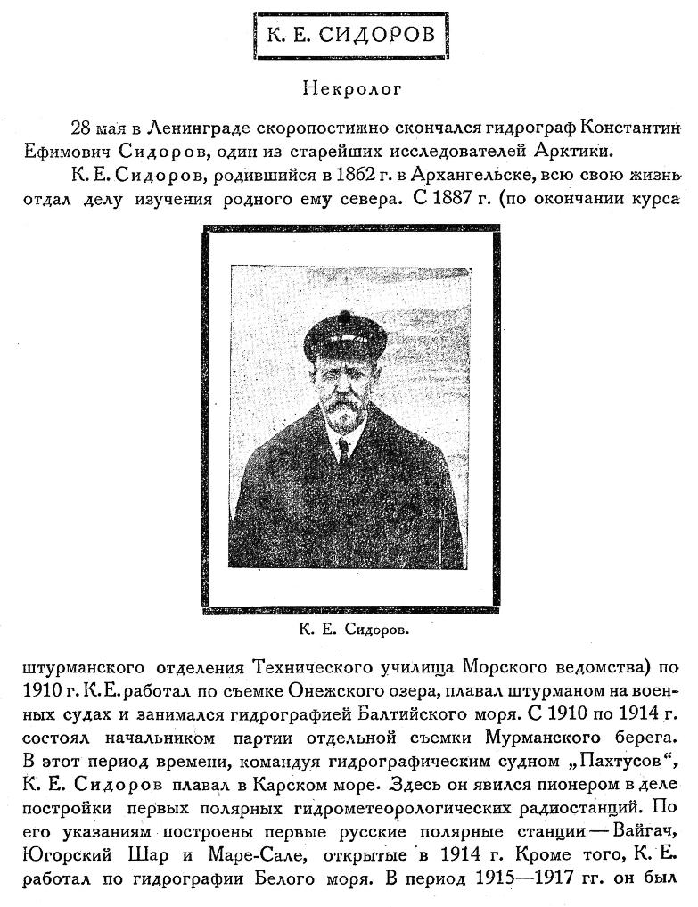 Морозов Н. В.К. Е. Сидоров был командиром тр. "Пахтусов" и более в Карском море не работал, равно как пионером-организатором и руководителем строительства станций Вайгач, Югорский Шар и Маре-Сале не является. ГГУ к организации и постройке станций отношения не имело. На Форуме, в темах про эти станции, есть все подробности.
