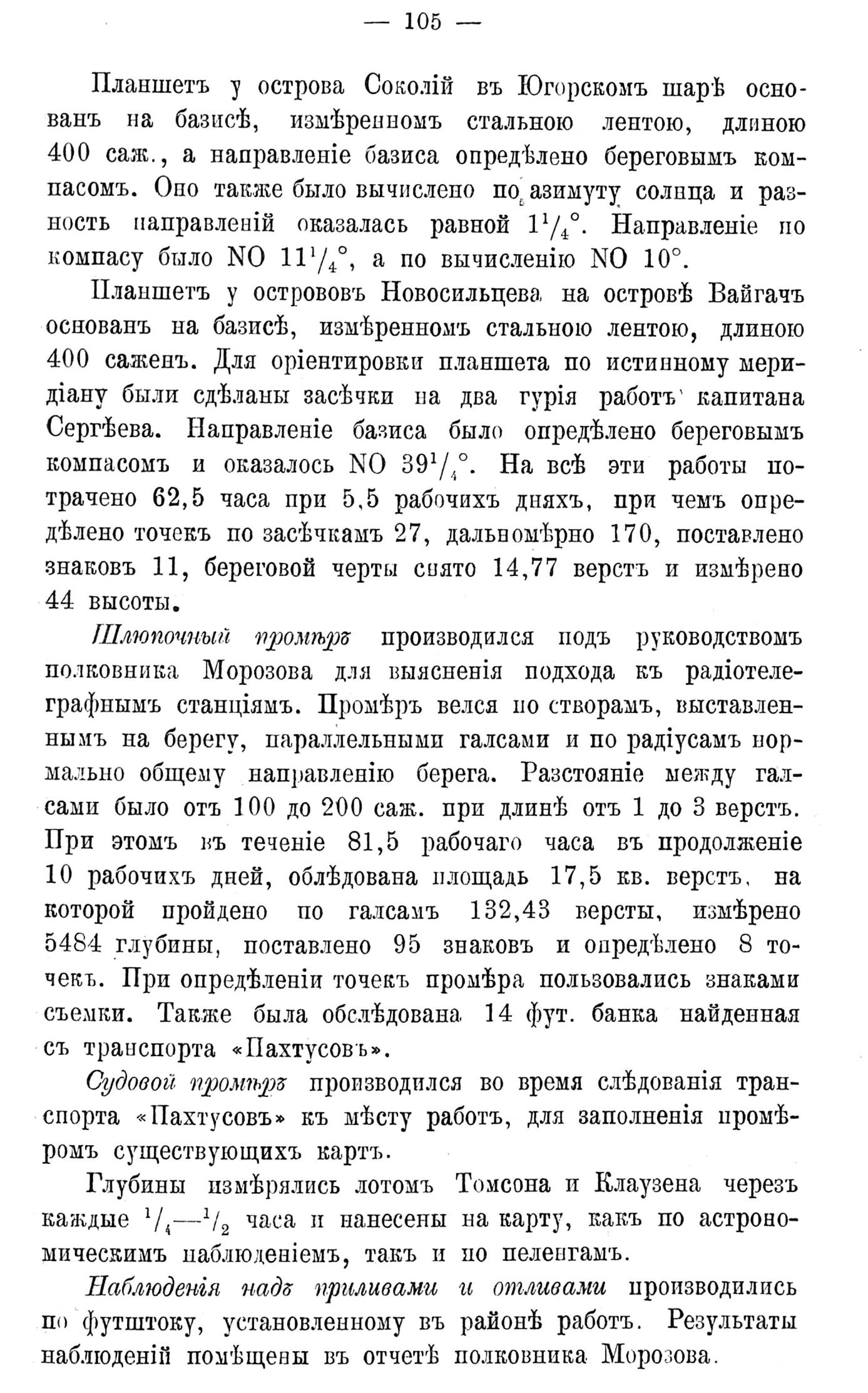 Планшетъ у острова Соколій въ Югорскомъ шарѣ основанъ на базисѣ, измѣренномъ стальною лентою, длиною 400 саж., а направленіе базиса определено береговымъ компасомъ. Оно также было вычислено по азимуту солнца и разность направленій оказалась равной 1 1/4°. Направленіе по компасу было NO 11 1/4°, а по вычисленію N0 10°.