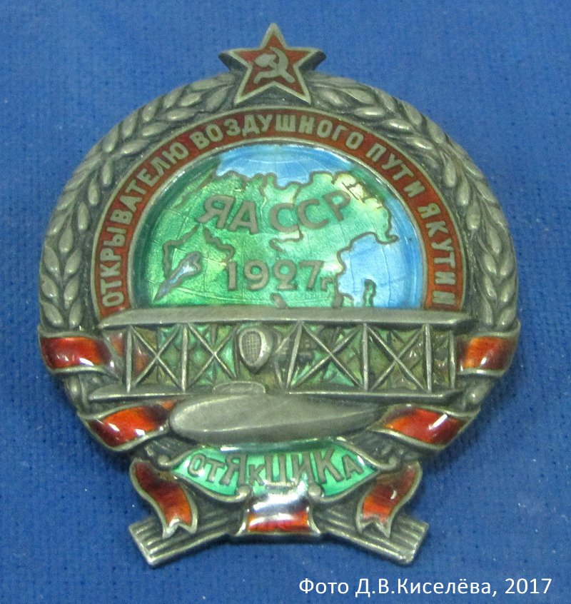 Уникальный нагрудный знак "Открывателю воздушного пути Якутии от ЯкЦИКа", учрежденный ЦИК Якутской АССР в 1927 г., выпущенный в 5 экземплярах и предназначенный для награждения участников Северной экспедиции Осоавиахима. Данный знак принадлежал Ф.М.Егерю, сфотографирован в экспозиции выставки "Иван Папанин - севастопольский Колумб" в музее-панораме "Оборона Севастополя".