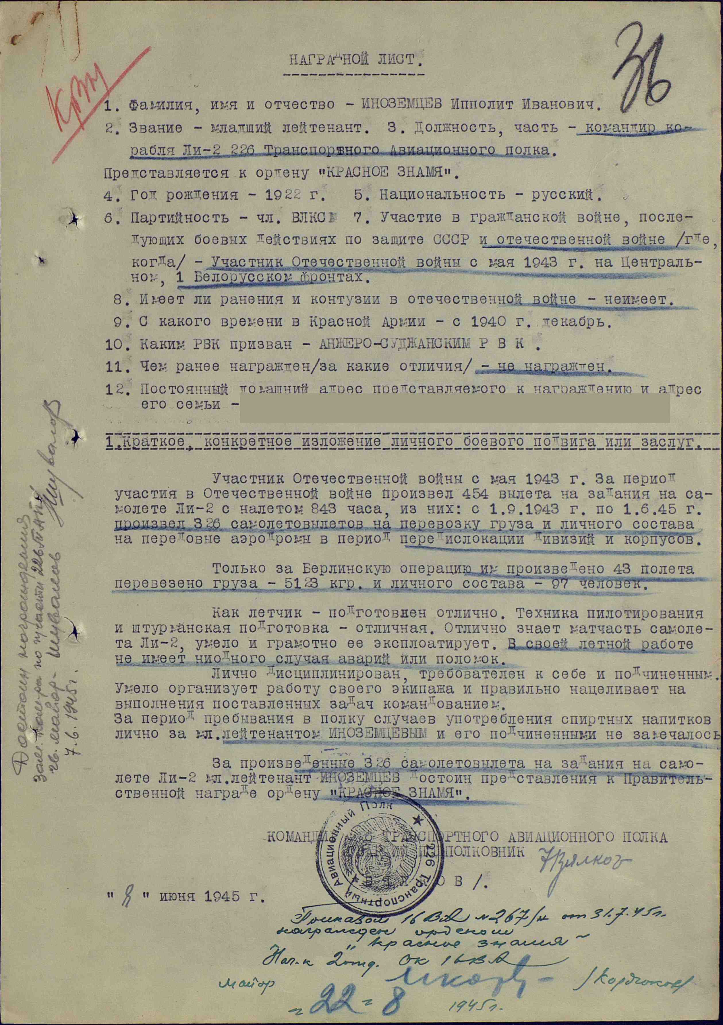 Полных данных об Ипполите Ивановиче Иноземцеве нет. Удалось найти наградной лист на него, как участника войны: