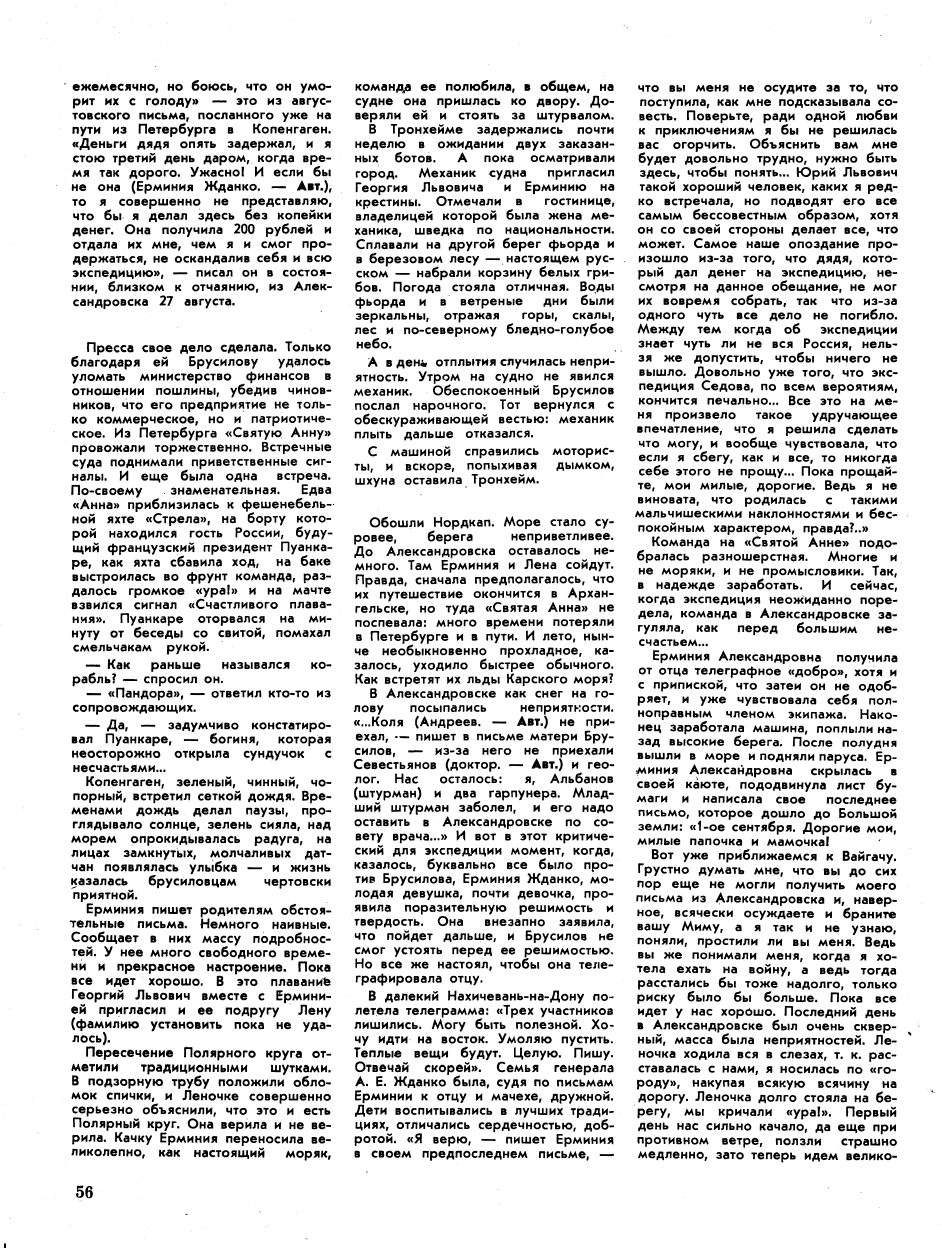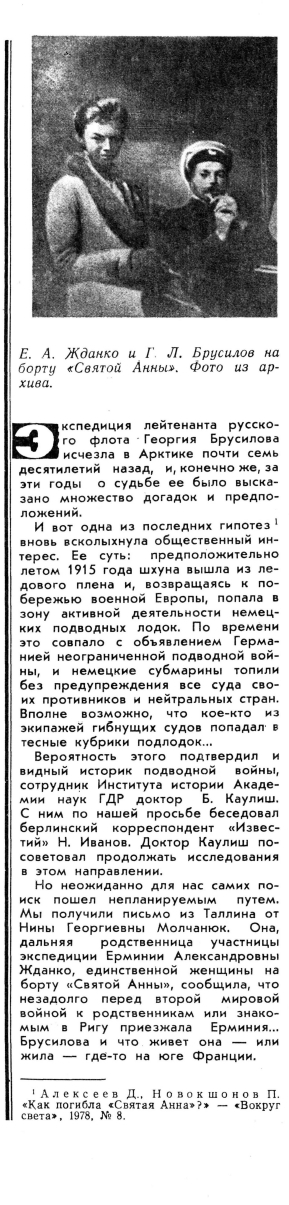 В Александровске как снег на голову посыпались неприятности. «...Коля (Андреев. — Авт.) не приехал, — пишет в письме матери Брусилов, — из-за него не приехали Севестьянов (доктор. — Авт.) и геолог. Нас осталось: я, Альбанов (штурман) и два гарпунера. Младший штурман заболел, и его надо оставить в Александровске по совету врача...» И вот в этот критический для экспедиции момент, когда, казалось, буквально все было против Брусилова, Ерминия Жданко, молодая девушка, почти девочка, проявила поразительную решимость и твердость. Она внезапно заявила, что пойдет дальше, и Брусилов не смог устоять перед ее решимостью. Но все же настоял, чтобы она телеграфировала отцу.