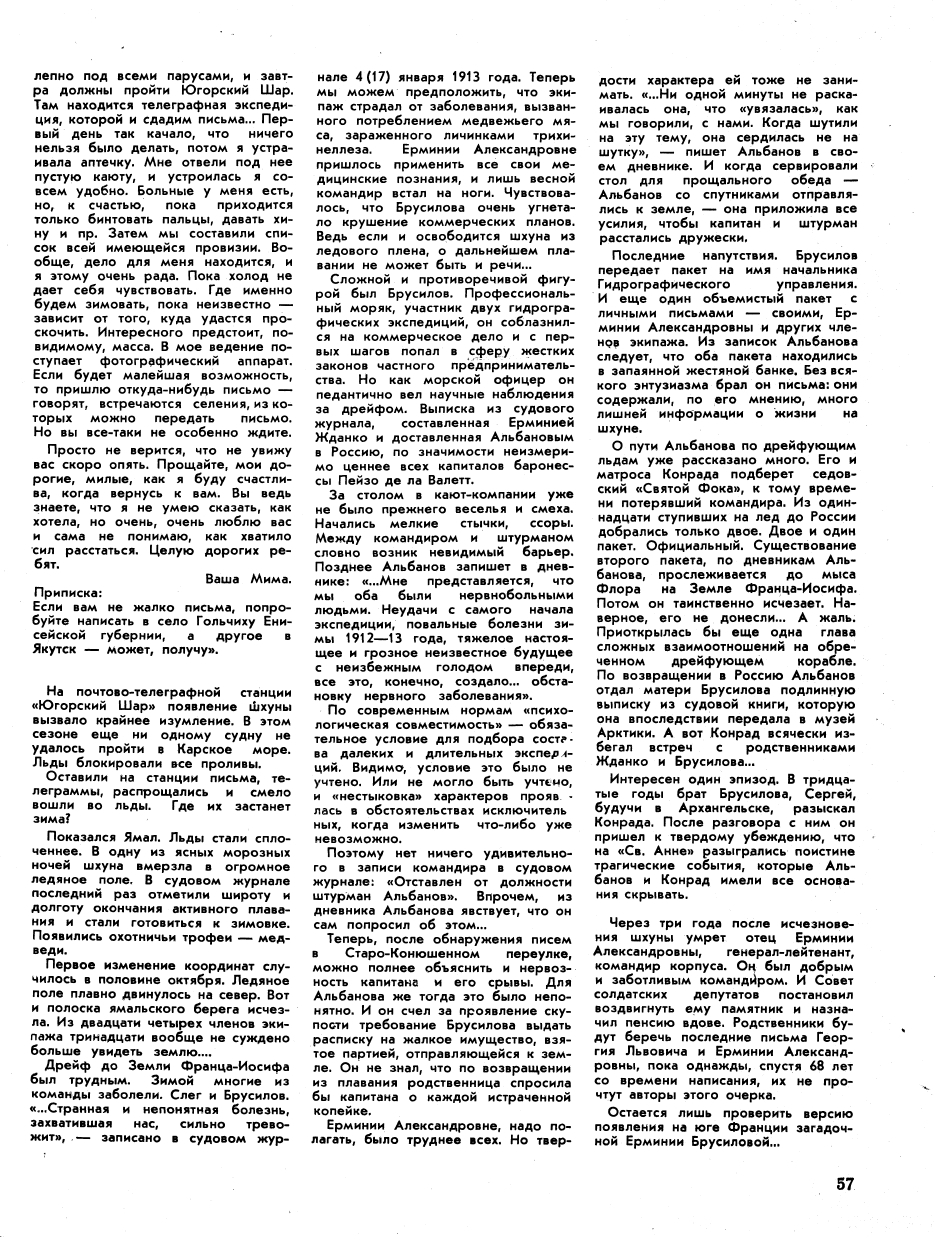 И еще один объемистый пакет с личными письмами — своими, Ерминии Александровны и других членов экипажа. Из записок Альбанова следует, что оба пакета находились в запаянной жестяной банке. Без всякого энтузиазма брал он письма: они содержали, по его мнению, много лишней информации о жизни на шхуне.
