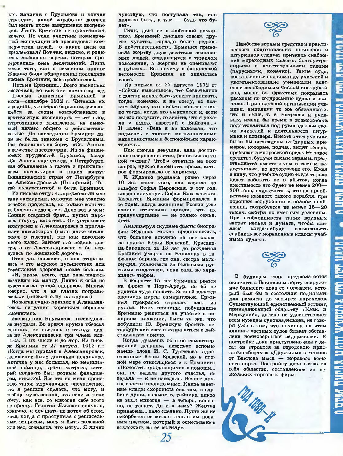 Ерминия Александровна получила от отца телеграфное «добро», хотя и с припиской, что затеи он не одобряет, и уже чувствовала себя полноправным членом экипажа. Наконец заработала машина, поплыли назад высокие берега. После полудня вышли в море и подняли паруса. Ерминия Александровна скрылась в своей каюте, пододвинула лист бумаги и написала свое последнее письмо, которое дошло до Большой земли: «1-ое сентября. Дорогие мои, милые папочка и мамочка!