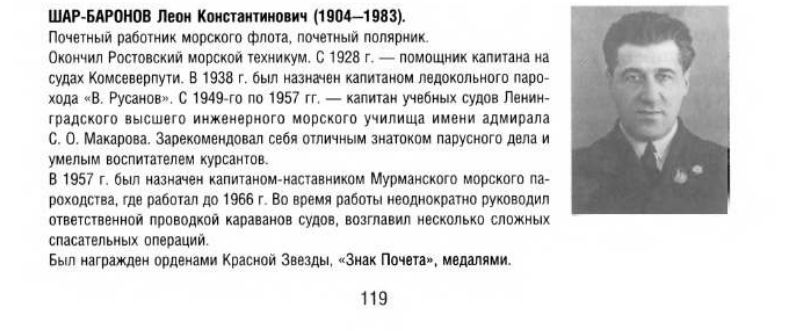 Встречался с капитаном-наставником Шар-Бароновым Л.К. в 1966 году на тх Вацлав Воровский. Он выходил с нами в рейс. Держал в руках его диплом, выданный еще до революции в гор.Батуми об окончании Батумского мореходного училища. Лист размером А4 на гербовой бумаге, заполненный витиеватым и красивым почерком опытного писаря. Диплом меня поразил - таких я больше никогда не видел. Грузный и седой капитан-наставник никому не мешал.Его выход в рейс об"яснялся первым самостоятельным рейсом бывшего старпома тх Вацлав Воровский - ПЕТРОВА Виктора Леонидовича, 1930 г.р.