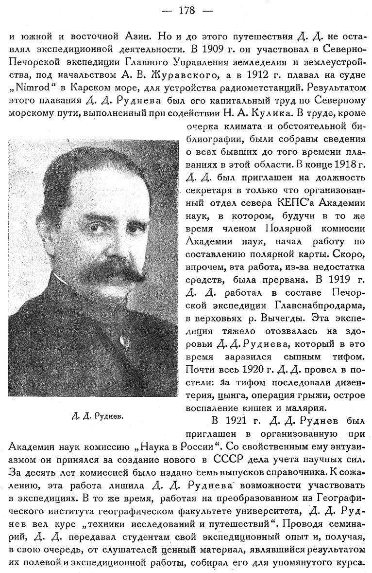 Д. Д. Руднев родился 7 сентября 1879 года в Петербурге. Получив образование в гимназии, Д. Д. Руднев сразу после окончания Петербургского Университета избрал своей специальностью географию. Летом 1904 г., будучи студентом, вместе с А. В. Журавским, А. А. Григорьевым и М. П. Шпарбергом, Д. Д. Руднев участвовал в экспедиции Географического об-ва в Большеземельскую тундру, в качестве ботаника, физико-географа и фотографа. За работу в этри_экспедиции Д. Д. Руднев был награжден Географическим об-вом золотой медалью. Поездка в Большеземельскую тундру определила дальнейшую судьбу Руднева, работа которого до конца жизни оказалась связанной с севером. Летом 1905 г. Д. Д. Руднев слушал лекции Рихтгофена, Маркуса, Гролля и других профессоров в Берлинском Университете. Возвратившись из-за границы, Руднев принял участие в организации и работе научных кружков в университете и создал Географический кружок (в 1906 г.) и Межкружковую организацию. В 1907 г., поступив лаборантом в Педагогический музей Военно-учебных заведений, Руднев организовал „Географическое бюро ", которое, кроме справочной работы, развивало энергичную лекционную деятельность, главным образом с целью подготовки исследователей. Работа Географического бюро привела в конце концов к разработке проекта специального Географического института, инициаторами которого были Д. Д. Руднев и его товарищ по работе Л. С. Багров. Хотя проект был составлен еще в 1913 г., институт, под названием „Высших географических курсов при Докучаевском почвенном комитете", начал свое существование лишь с 1916 г. Империалистическая война застала Д. Д. Руднева в Китае, где он находился, совершая кругосветное путешествие на средства специальной, только что основанной стипендии Министерства народного просвещения. Д. Д. Рудневу пришлось совершить только первую часть путешествия — по западной Европе, северной Африке и южной и восточной Азии. Но и до этого путешествия Д. Д. не оставлял экспедиционной деятельности. В 1909 г. он участвовал в Северно-Печорской экспедиции Главного Управления земледелия и землеустройства, под начальством А. В. Журавского, а в 1912 г. плавал на судне „Nimrod" в Карском море, для устройства радиометстанций. Результатом этого плавания Д. Д. Руднева был его капитальный труд по Северному морскому пути, выполненный при содействии Н. А. Кулика. В труде, кроме очерка климата и обстоятельной библиографии, были собраны сведения о всех бывших до того времени плаваниях в этой области. В конце 1918 г. Д. Д. был приглашен на должность секретаря в только что организованный отдел севера КЕПС'а Академии наук, в котором, будучи в то же время членом Полярной комиссии Академии наук, начал работу по составлению полярной карты. Скоро, впрочем, эта работа, из-за недостатка средств, была прервана. В 1919 г. Д. Д. работал в составе Печорской экспедиции Главснабпродарма, в верховьях р. Вычегды. Эта экспедиция тяжело отозвалась на здоровьи Д.Д.Руднева, который в это время заразился сыпным тифом. Почти весь 1920 г. Д. Д. провел в постели: за тифом последовали дизентерия, цынга, операция грыжи, острое воспаление кишек и малярия.В 1921 г. Д. Д. Руднев был приглашен в организованную при Академии наук комиссию „Наука в России". Со свойственным ему энтузиазмом он принялся за создание нового в СССР дела учета научных сил. За десять лет комиссией было издано сем