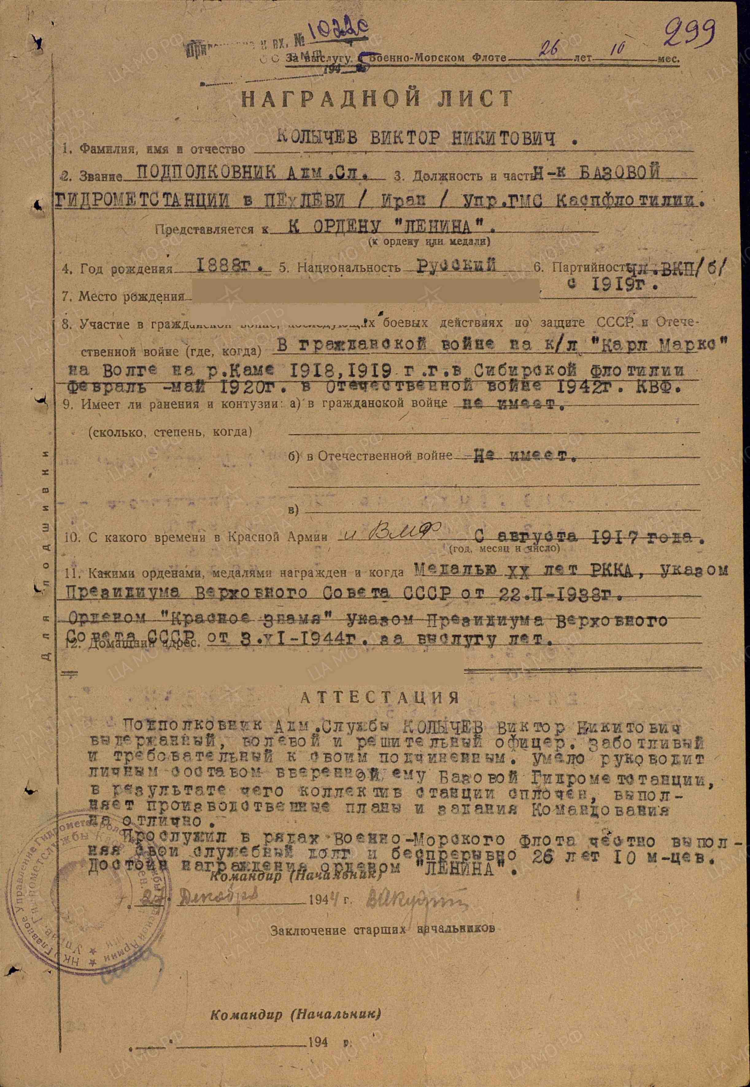 Место службы: базовая гидрометеорологическая станция Пехлеви /Иран/ КВФл