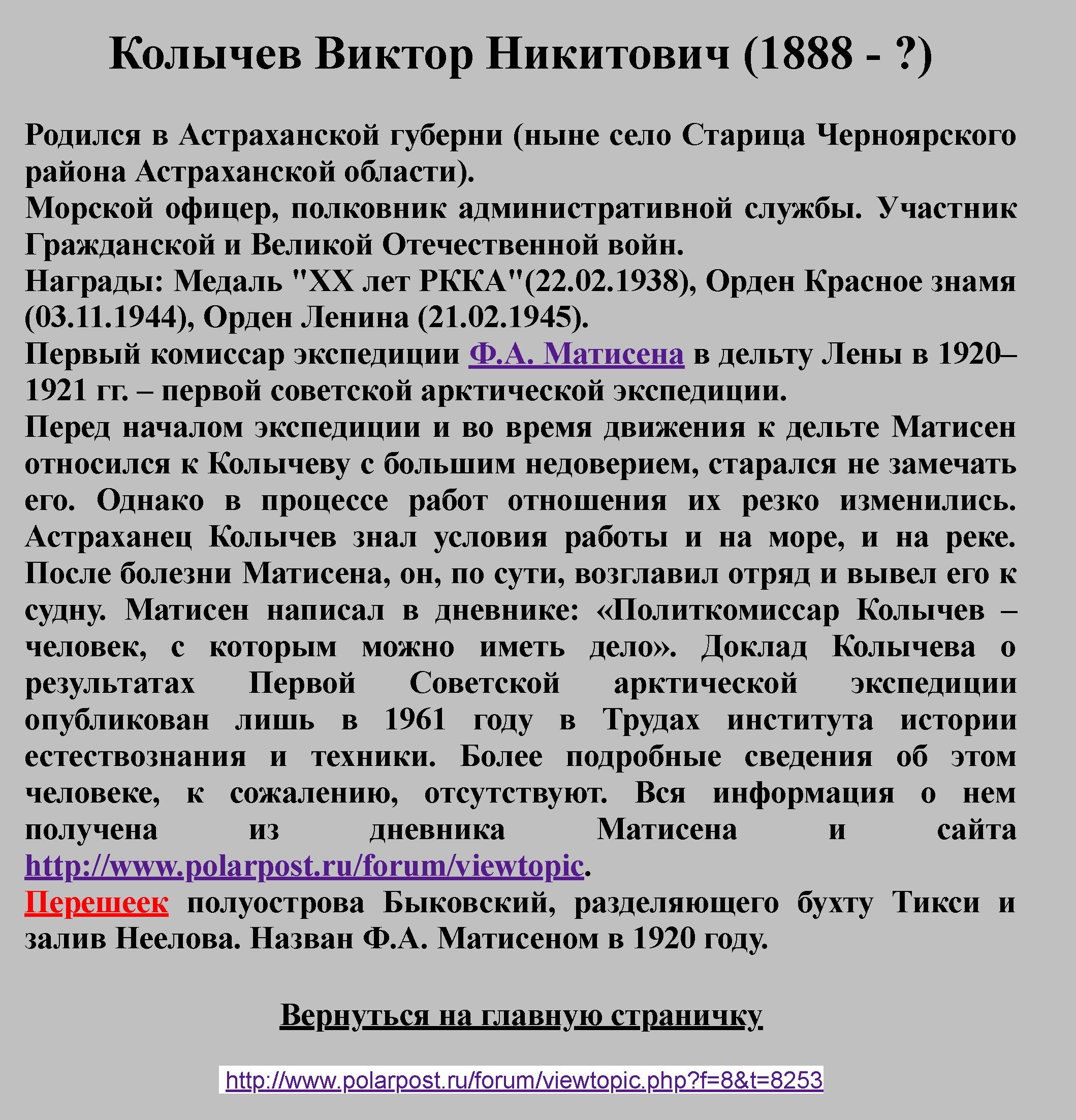 Долго и тщетно искал я в архивах сведения об этом человеке. В 1961 г. Л. А. Гольденберг и С. П. Носов в "Трудах Института истории естествознания и техники" (т. 37, вып. 2) опубликовали доклад В. Н. Колычева о Первой Советской арктической экспедиции, сделанный 23 января 1921 г. и хранящийся в Центральном государственном архиве Красной Армии СССР. К сожалению, никаких подробностей о комиссаре и его дальнейшей судьбе они привести не смогли. Даже имя и отчество и место предыдущей работы удалось узнать лишь из дневника Матисена.